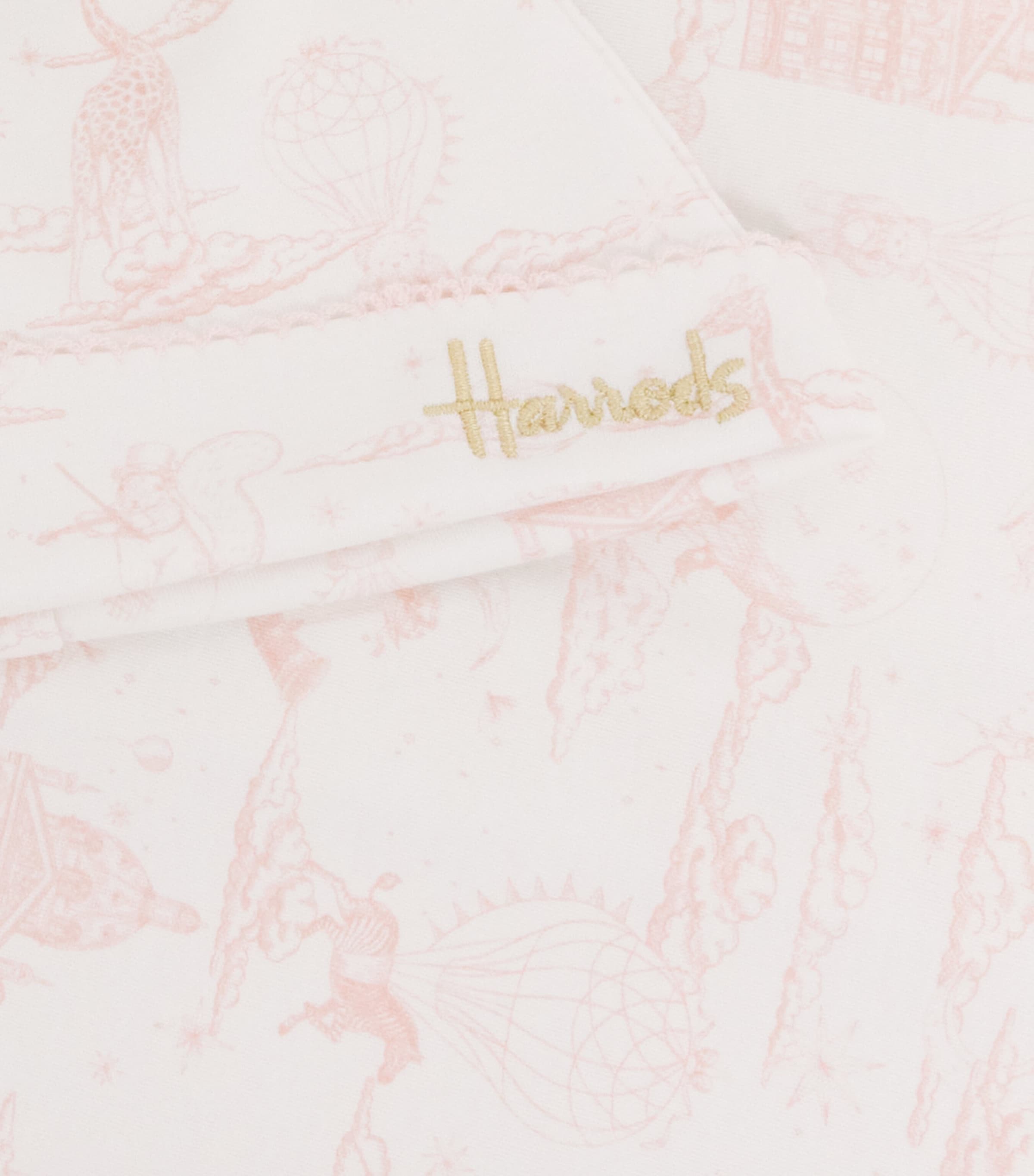 Infused with Harrods’ playful spirit, this baby all-in-one and hat set brings a sense of wonder to bedtime. The soft cotton is adorned with charming illustrations of giraffes, rabbits and hot air balloons floating through the clouds – a whimsical echo of the brand’s imaginative world.
