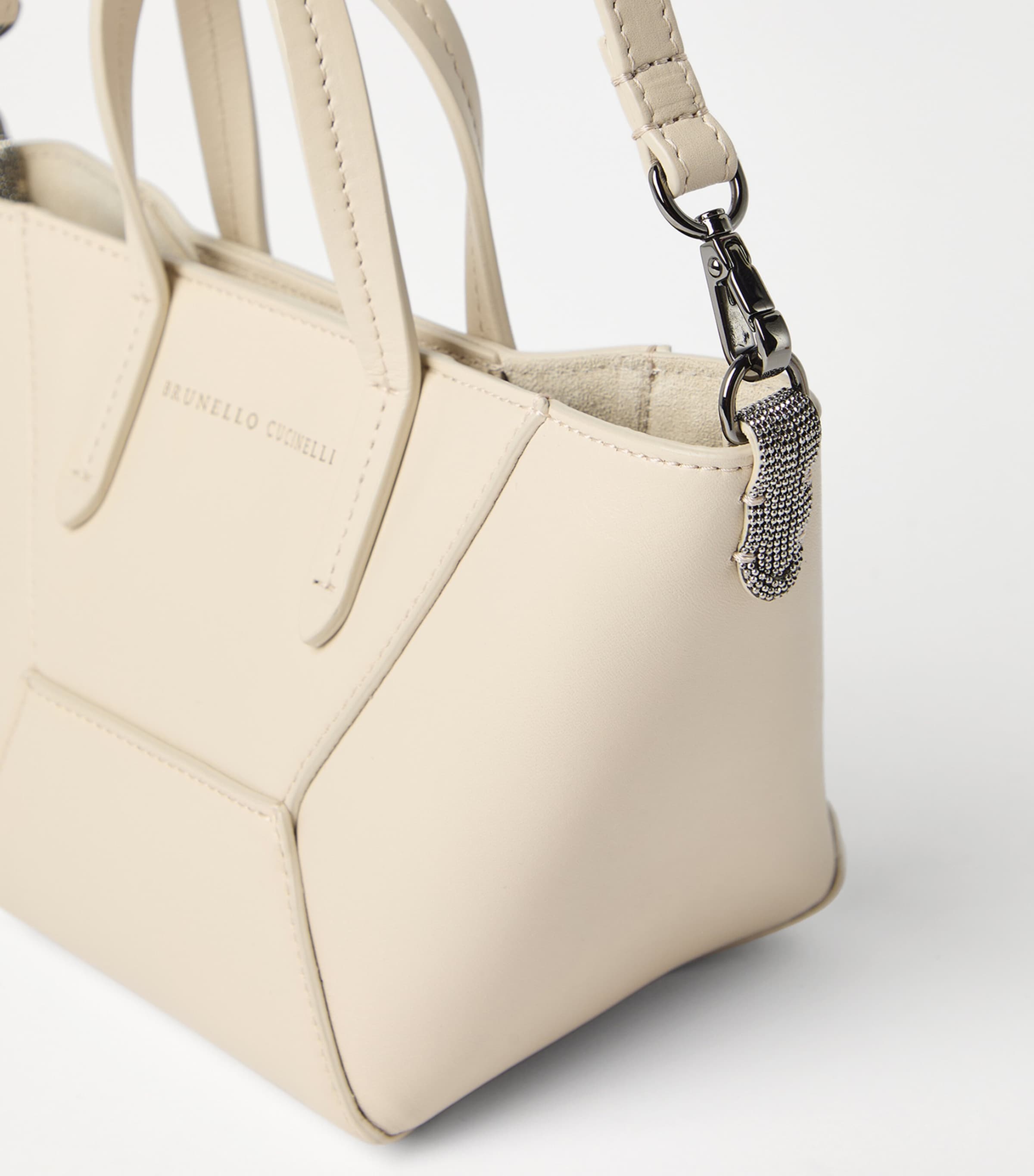 Rendered in soft but durable calfskin, this rendition of Brunello Cucinelli’s BC Duo bag is this season’s It accessory. The design's diagonal weave provides strength, which means the tote style, with its square, minimalist lines, maintains its shape. Elsewhere, precious monili beads add a delicate shimmer.