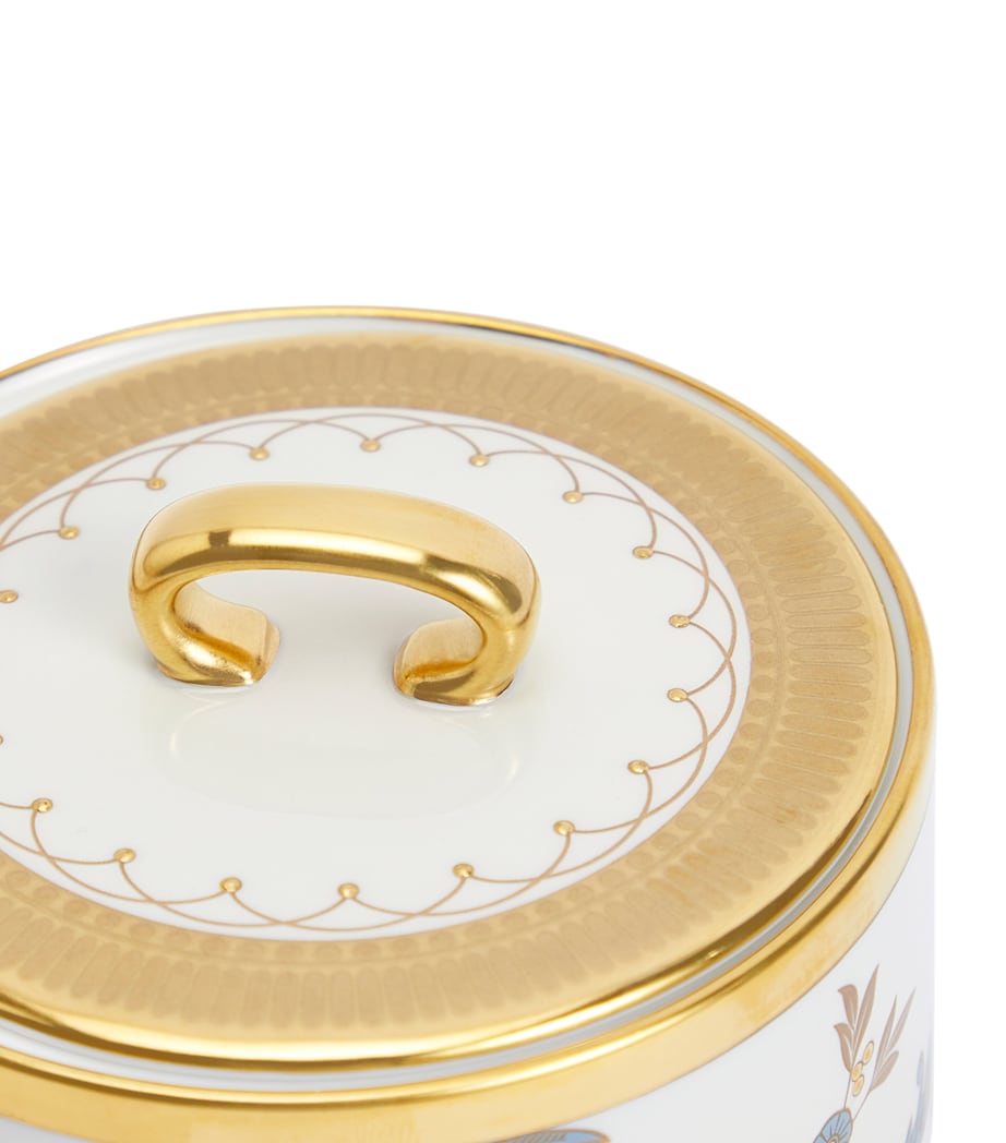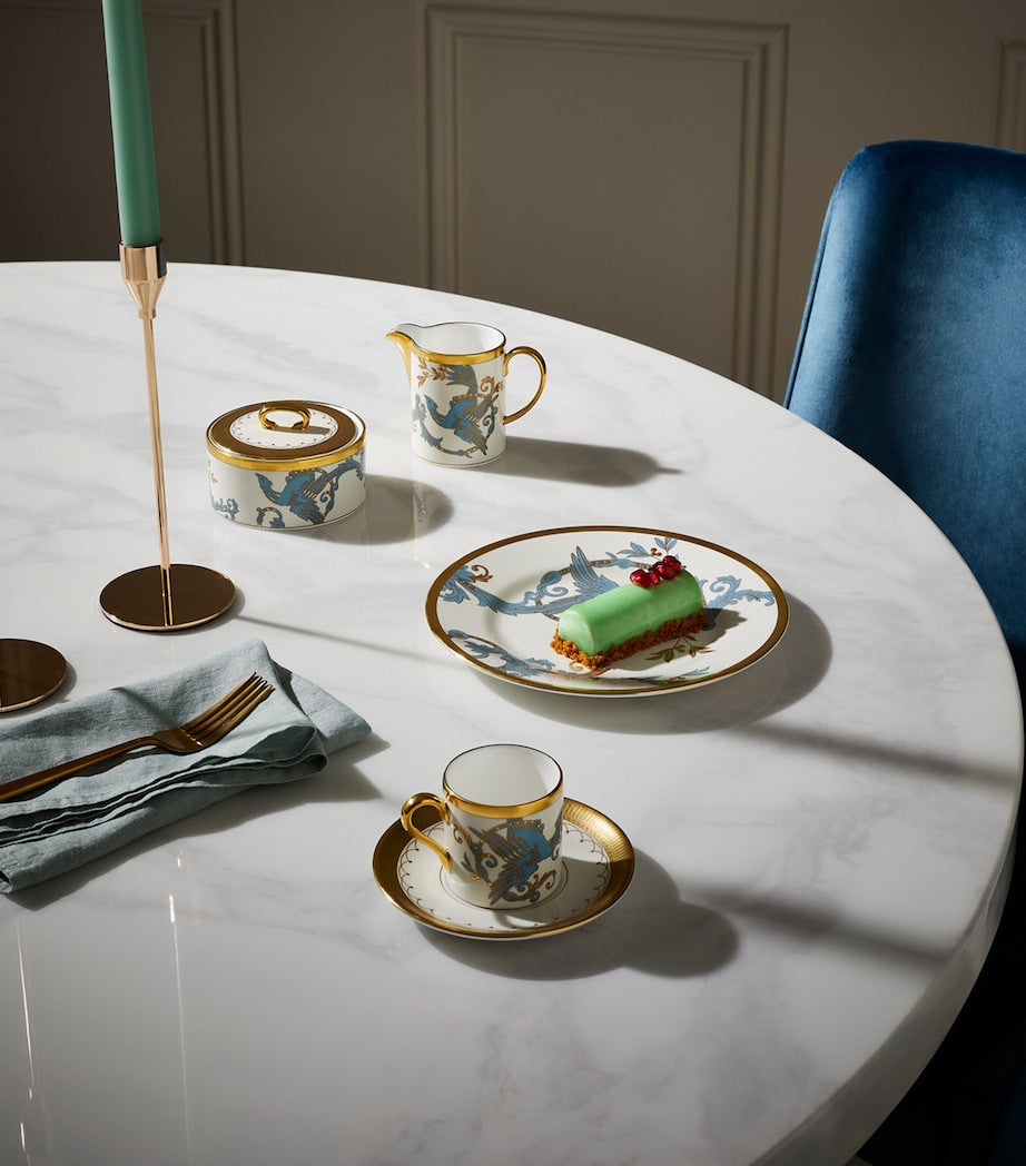 Wedgwood’s Phoenix collection is reborn and rises out of one of its oldest patterns, the Florentine print that was first introduced in 1931. A phoenix is plucked from the original pattern and soars across the bone china backdrop of this sugar pot and creamer jug set, hand-painted in jasperware and trimmed with 22-karat gold.