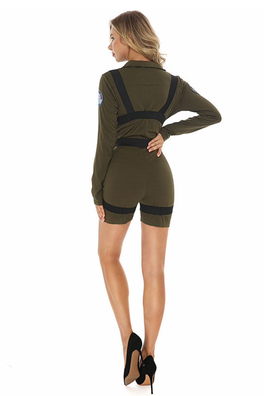 يتضمن زي المظليين المثير هذا للهالوين بدلة جسم خضراء كاكي بأكمام طويلة، وسحاب أمامي، ورقع، وحزام أسود.