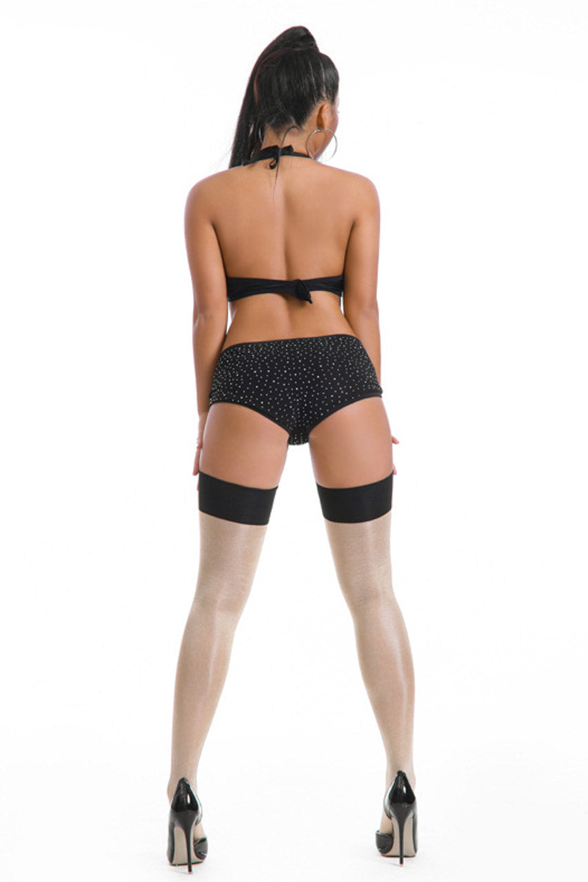 These shiny thigh high stockings feature a contrast band top.