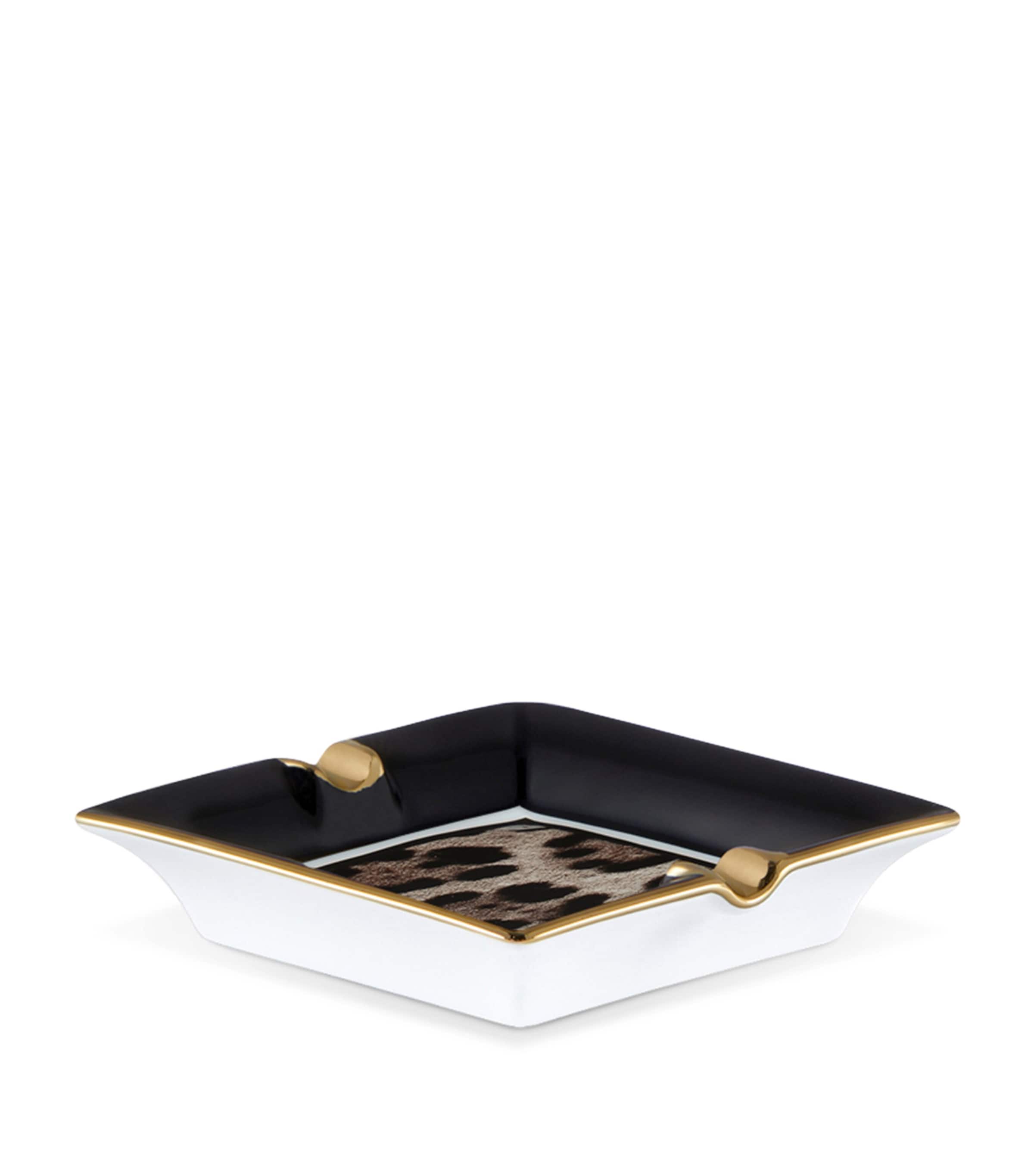 Despite its lack of a logo, the mere use of a leopard print instantly marks this elegant ashtray as a creation of Dolce & Gabanna casa. The iconic motif is sealed into porcelain in the brand's home country of Italy with a hand-painted glaze, and finished with manual gold-tone brushstrokes around th gilded rim.