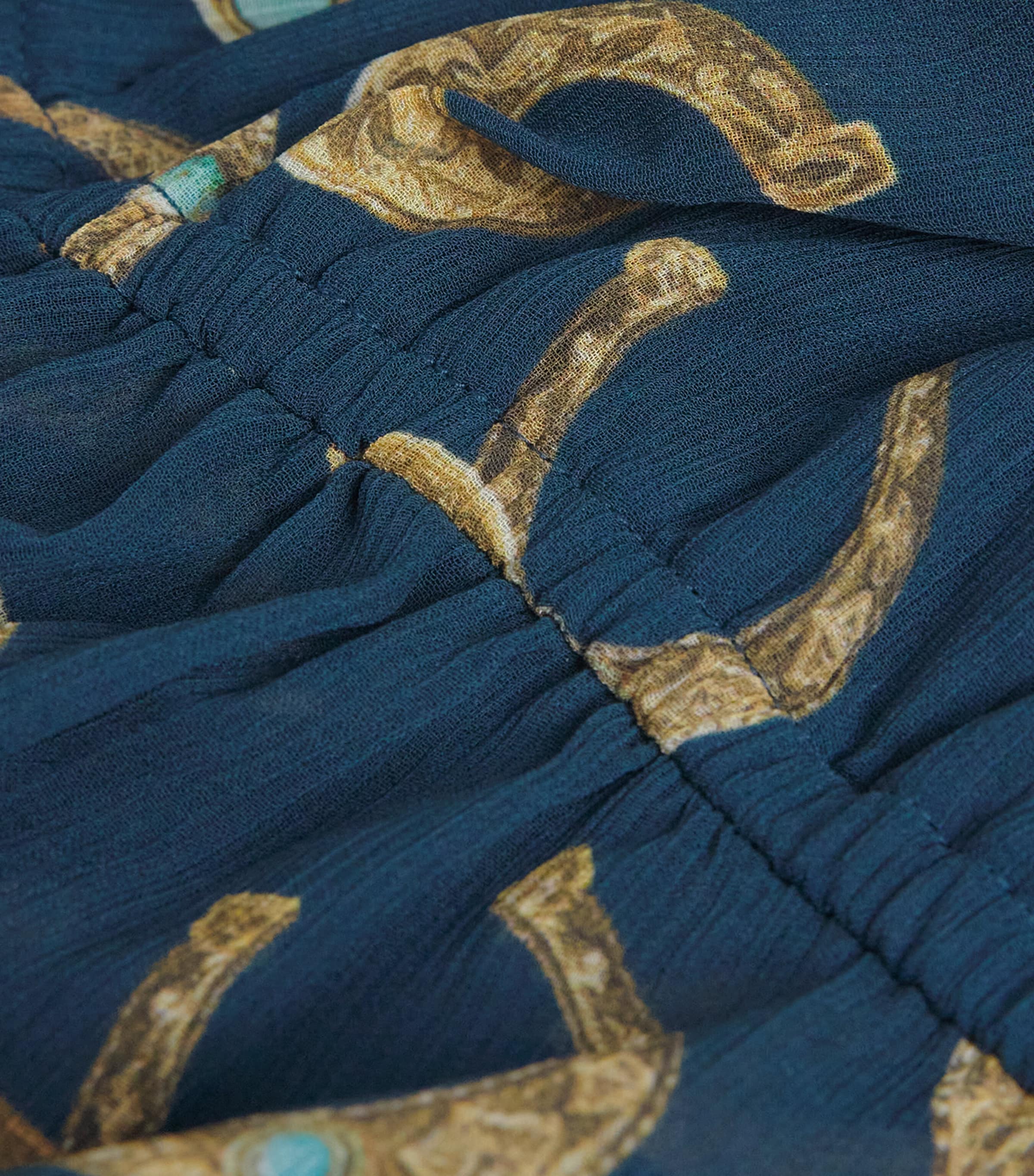 صُنعت هذه البدلة من التول الشفاف المريح، وتُستوحي تصميمها من أجواء الفروسية الكلاسيكية بنقش حدوة الحصان المميز للعلامة التجارية. كل حذاء ذهبي مرصع بحجر كريم فيروزي لامع لإضفاء لمسة مميزة، بينما يُضفي حزام قماشي لمسة من الأناقة على التصميم.