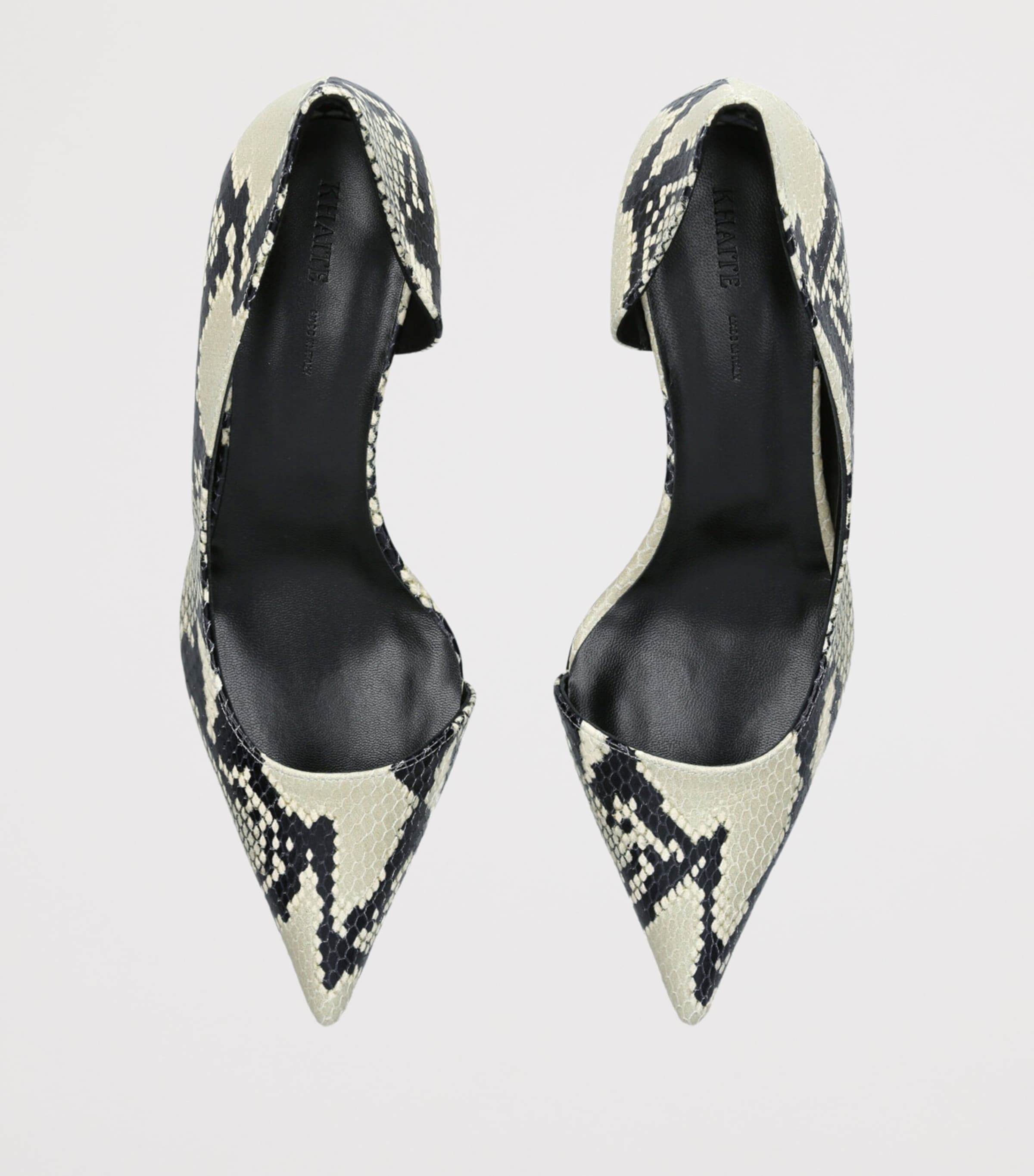 The sleek Jett D'Orsay pump from KHAITE is immediately striking, featuring the tactile texture of python-embossed calfskin and a sharp pointed-toe silhouette. The upper includes a curvy cutaway designed to reveal the arch of the foot, showing how the impeccable Italian-made construction guarantees a refined and flattering form.