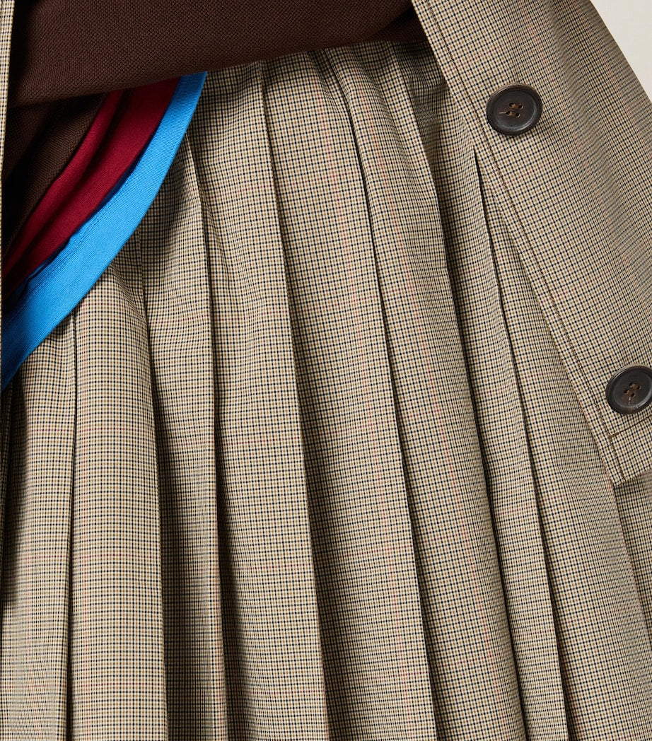 في أحدث مجموعاتها، استوحت ميو ميو تصاميمها من عالم التصميم الجامعي، لتقدم قطعًا جذابة ومصممة بدقة. صُنعت هذه التنورة المطوية من مزيج من القطن والنايلون، وتُبرز أصولها من خلال طبعة مربعات أنيقة وتصميم مطوية.