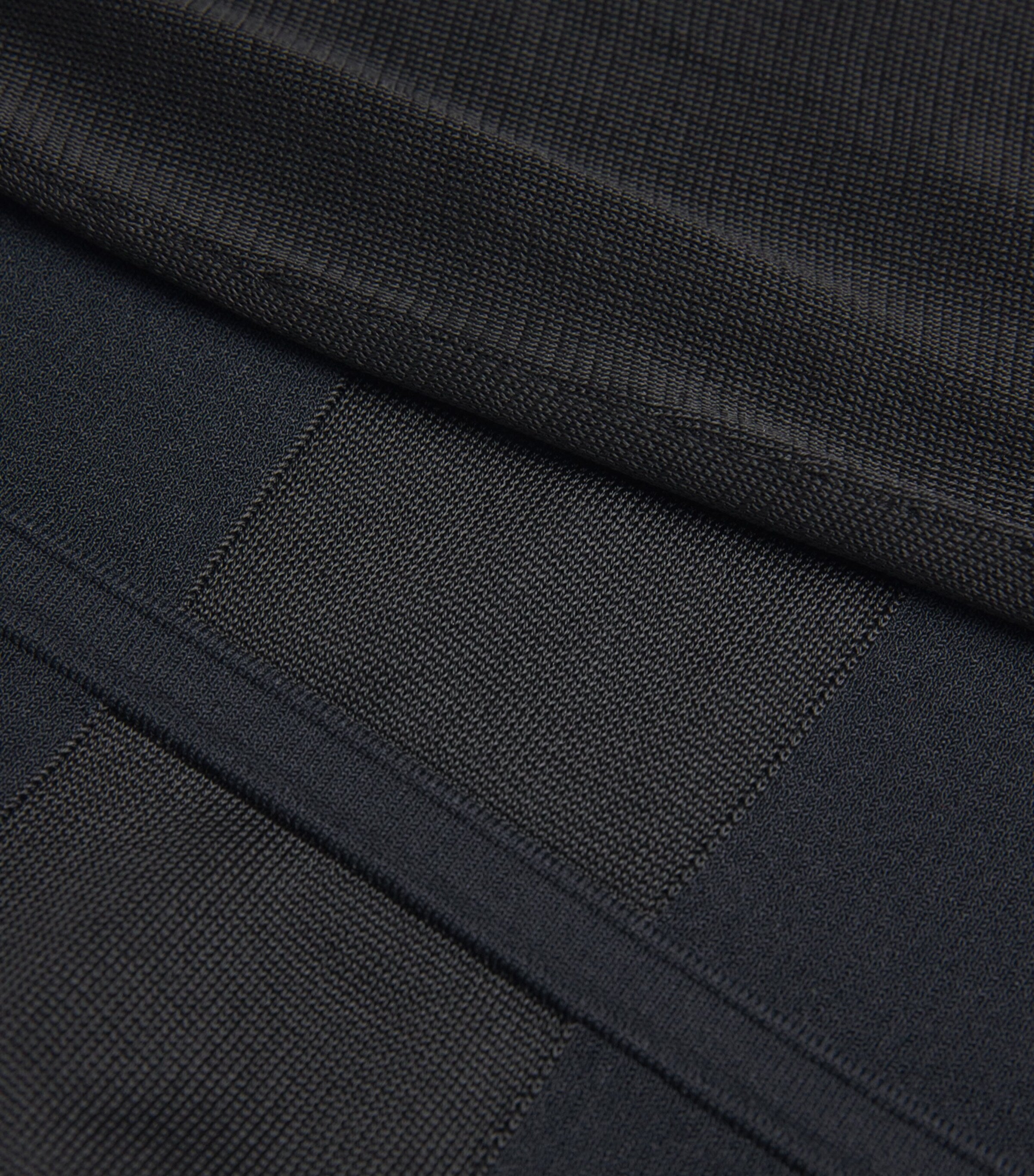 يتجلى شغف نينسي دوجاكا بالخطوط المنحنية في هذا البدلة الجيرسي. أكمامها الطويلة وألواحها الشبكية الشفافة تُبرز ملامح القوام الأنثوي، مع مراعاة كل درزة بعناية لتعزيز شكلها الطبيعي.