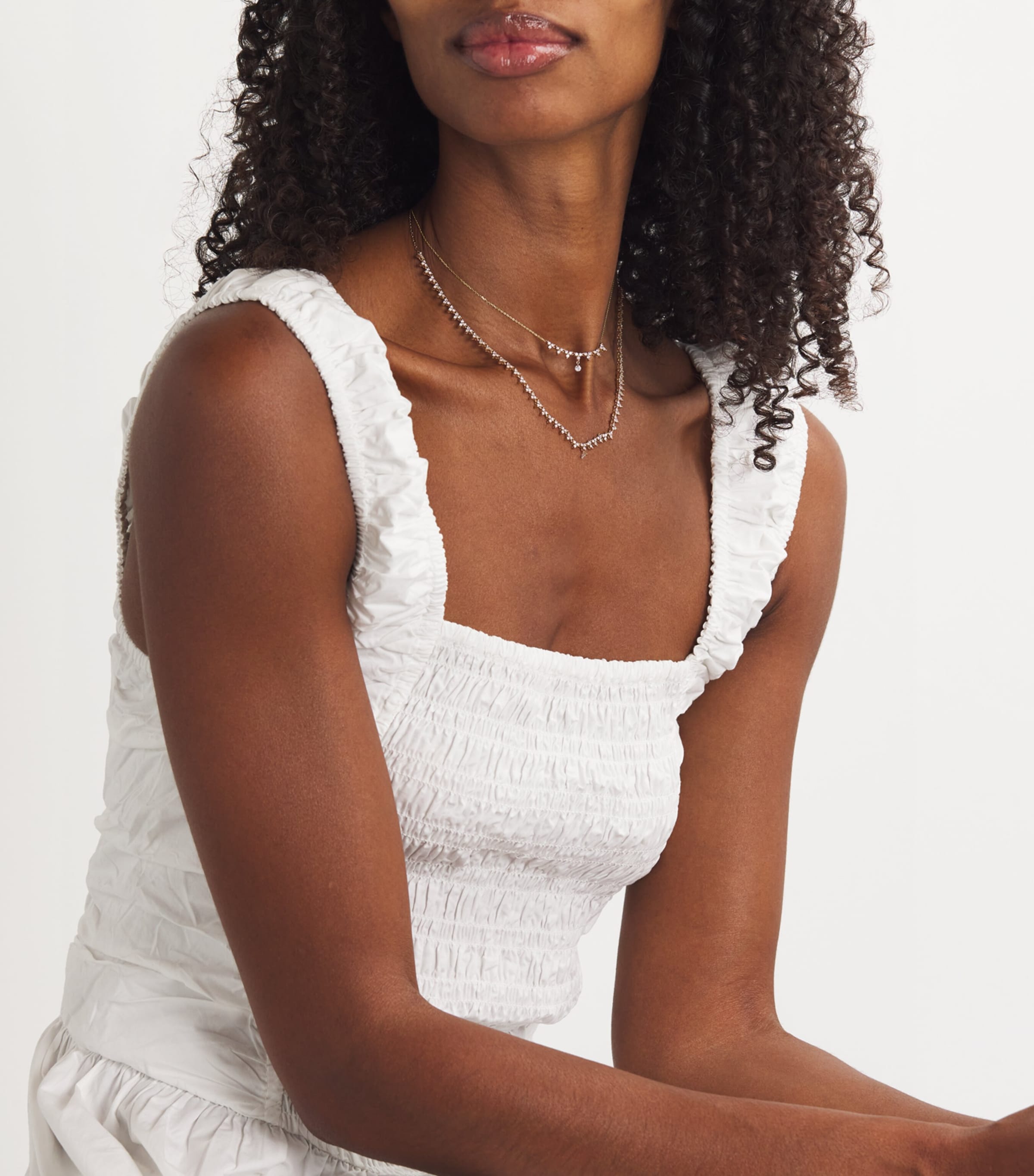 صُممت هذه القلادة من بيرسي باريس لتخلق وهمًا بأن الأحجار الكريمة تطفو على سطح البشرة، وتتألق ماساتها المميزة "المثقوبة" ببريقٍ أكثر إشراقًا مع كل موسم. تتزين هذه القلادة، التي تُعدّ لمسة عصرية على تصميم كلاسيكي مستوحى من أحذية التنس، بمجموعة كبيرة من الماسات البيضاء المستديرة المرصوفة على شكل مثلثات أنيقة، لتتألق مع كل حركة تقومين بها.