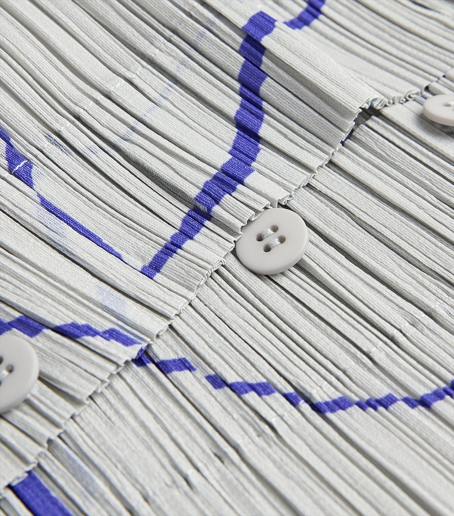 أتقنت إيسي مياكي، من خلال تصاميمها المميزة، فنّ التقاط الحركة والملمس من خلال طياتها المميزة، وتسعى الآن إلى تأطير هذه السلاسة في مجموعة "باوز". طبعة لافتة تتسلل بأناقة على قماش هذا الجاكيت المستوحى من الكريب، مصوّرةً خطوط الأجسام في أوضاع مختلفة، تكريمًا لقوة الحركة وقدرتها.
