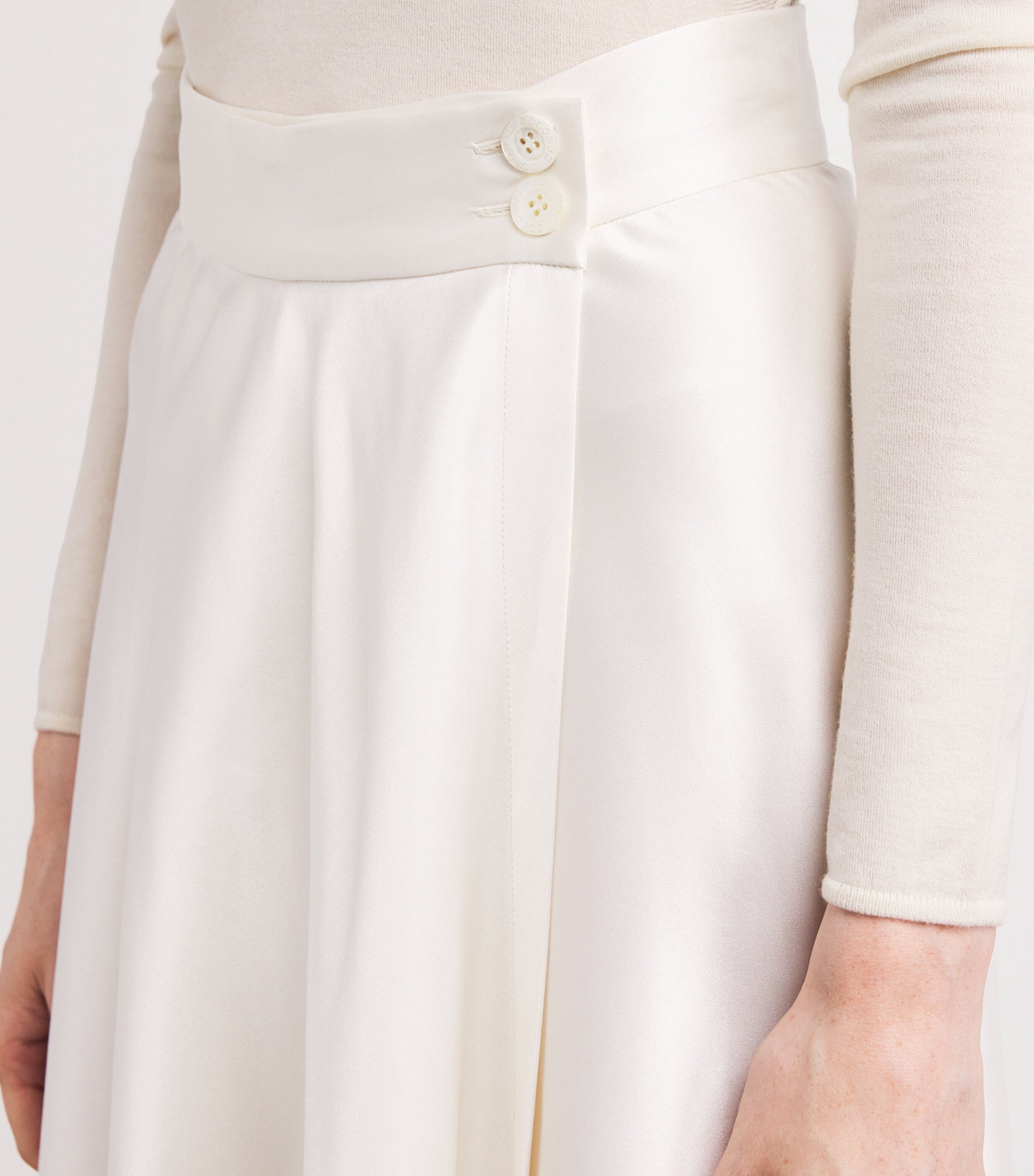 تُضفي الطيات الرقيقة لمسةً من الحيوية على طابع الحرير المتلألئ. تصاميم كولومبو لا تحتاج إلى صخبٍ لتُسمع؛ فثقتها الواثقة تكمن في جودة القماش وصناعته. تُجسّد هذه التنورة الطويلة هذه الروح بكل سهولة، حيث تُلفّ الحرير العاجي الخالص في منحنيات انسيابية تلتقط الضوء وتُبرز توهجه المتلألئ.