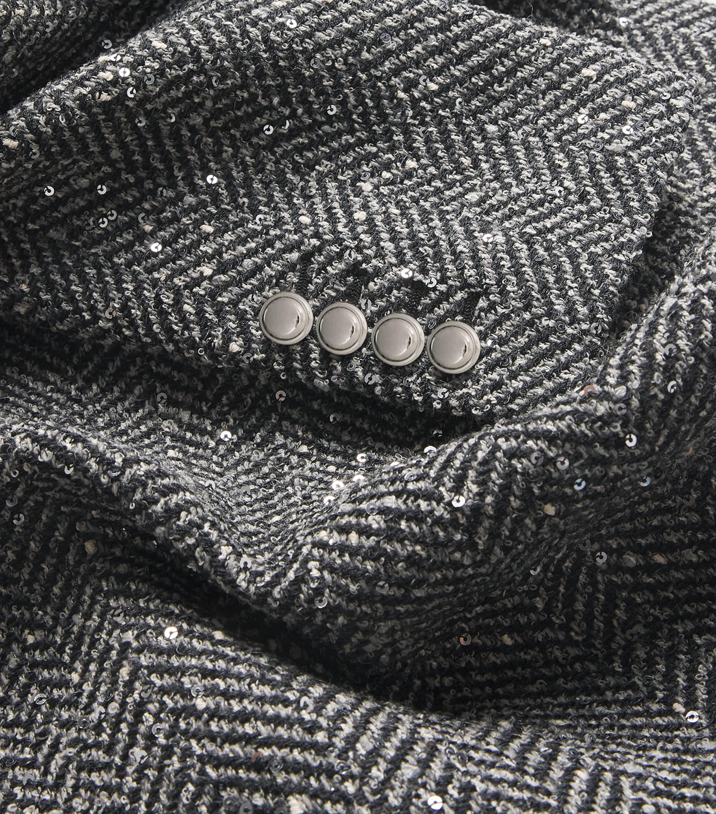 لا تُفضل أليساندرا ريتش الملابس الخارجية التقليدية. فطابع فساتينها المميزة يتطلب طبقة خارجية تُبرز فخامة التصميم: إليكِ هذا المعطف. الطبقة الخارجية من التويد المزخرف مُزينة بالترتر اللامع، ومُزينة بأزرار مُرصّعة بالكريستال لإضفاء لمسة من التألق.