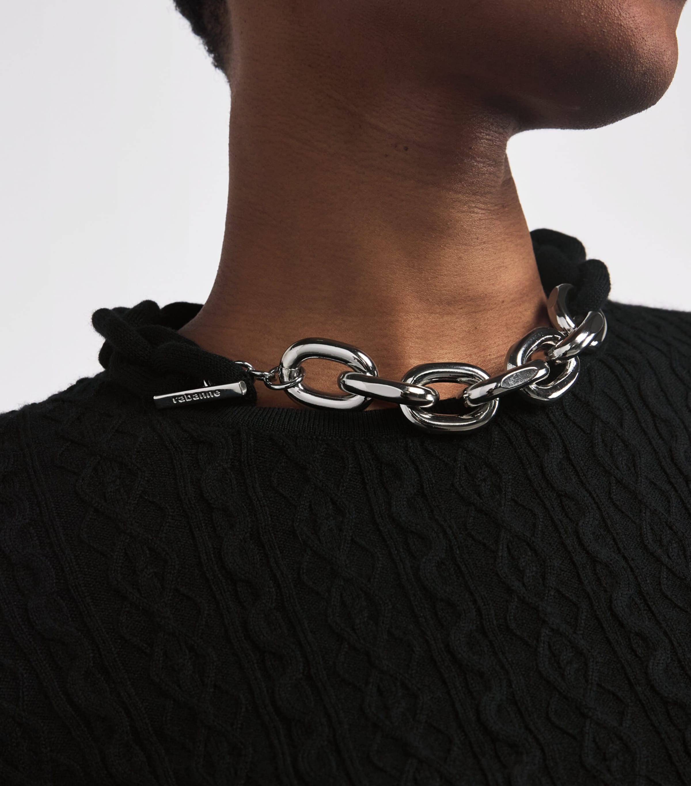 اسم باكو رابان يكاد يكون مرادفًا للإكسسوارات الفاخرة، لذا فإن تفاصيل هذا التصميم لا تُفاجئك. يغني هذا الفستان عن أي قلادات، فهو مزين بسلسلة أنيقة على طول خط العنق المكشكش، مما يُخفف عنك عناء وجهد تصميم إطلالة موسمية مفعمة بالتألق والشخصية المميزة.