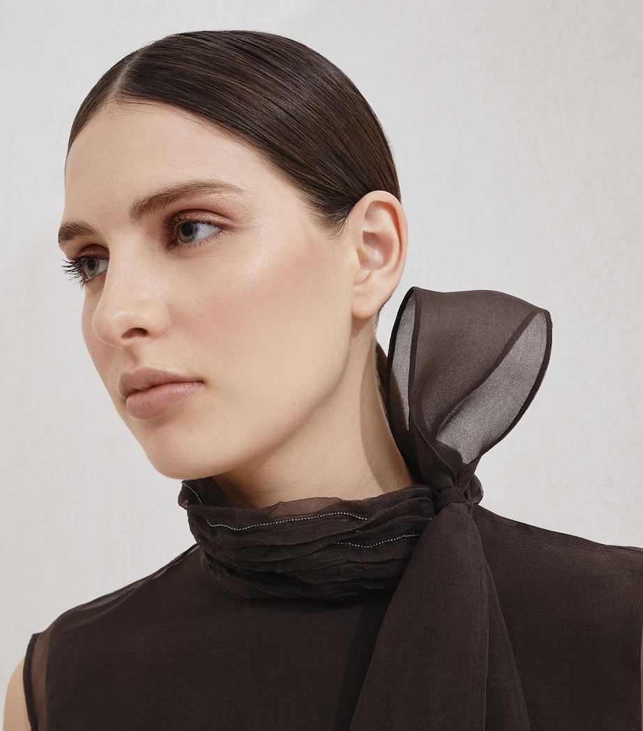 بلوزة برونيلو كوتشينيلي بنية من الحرير بدون أكمام مع فيونكة