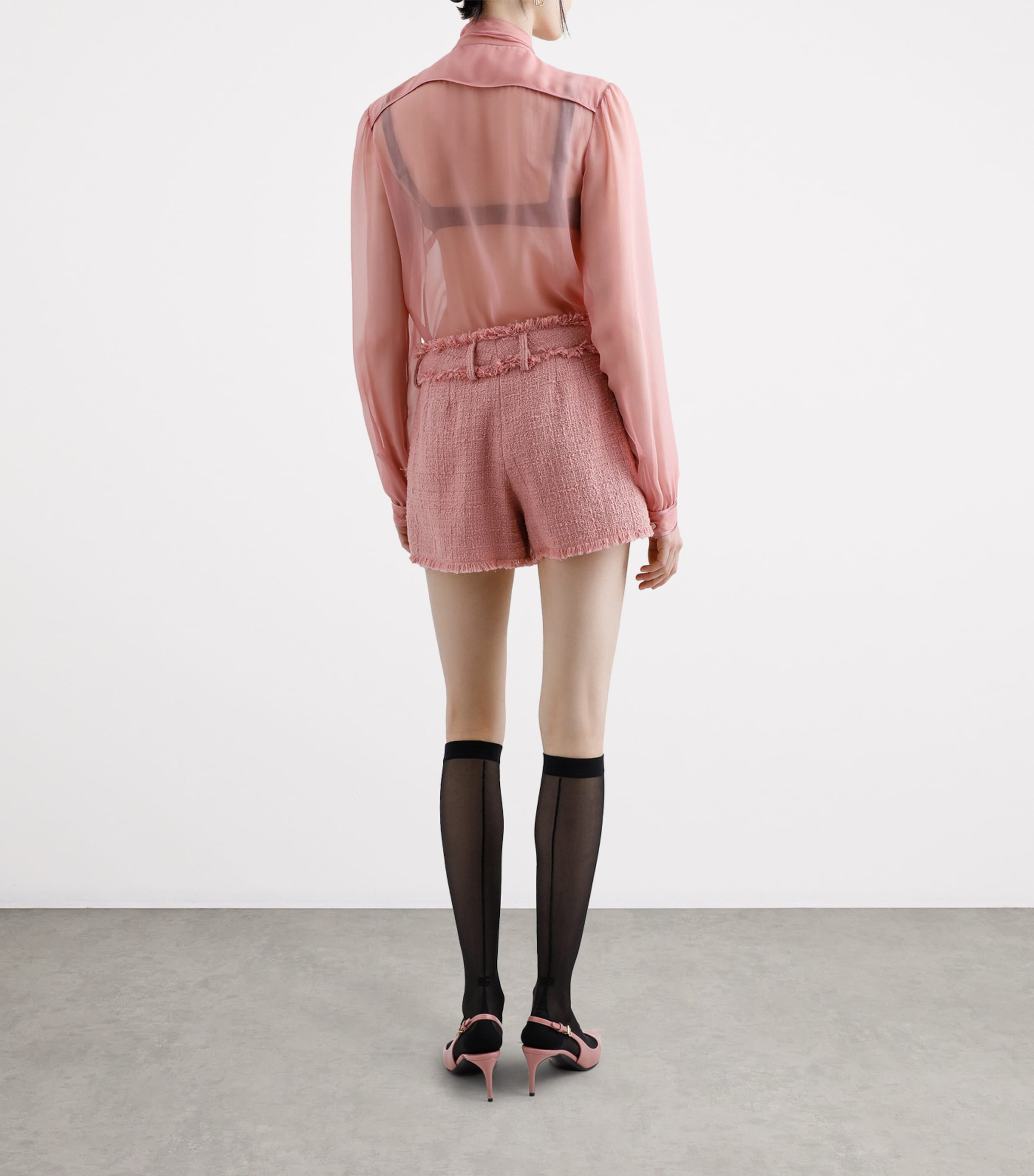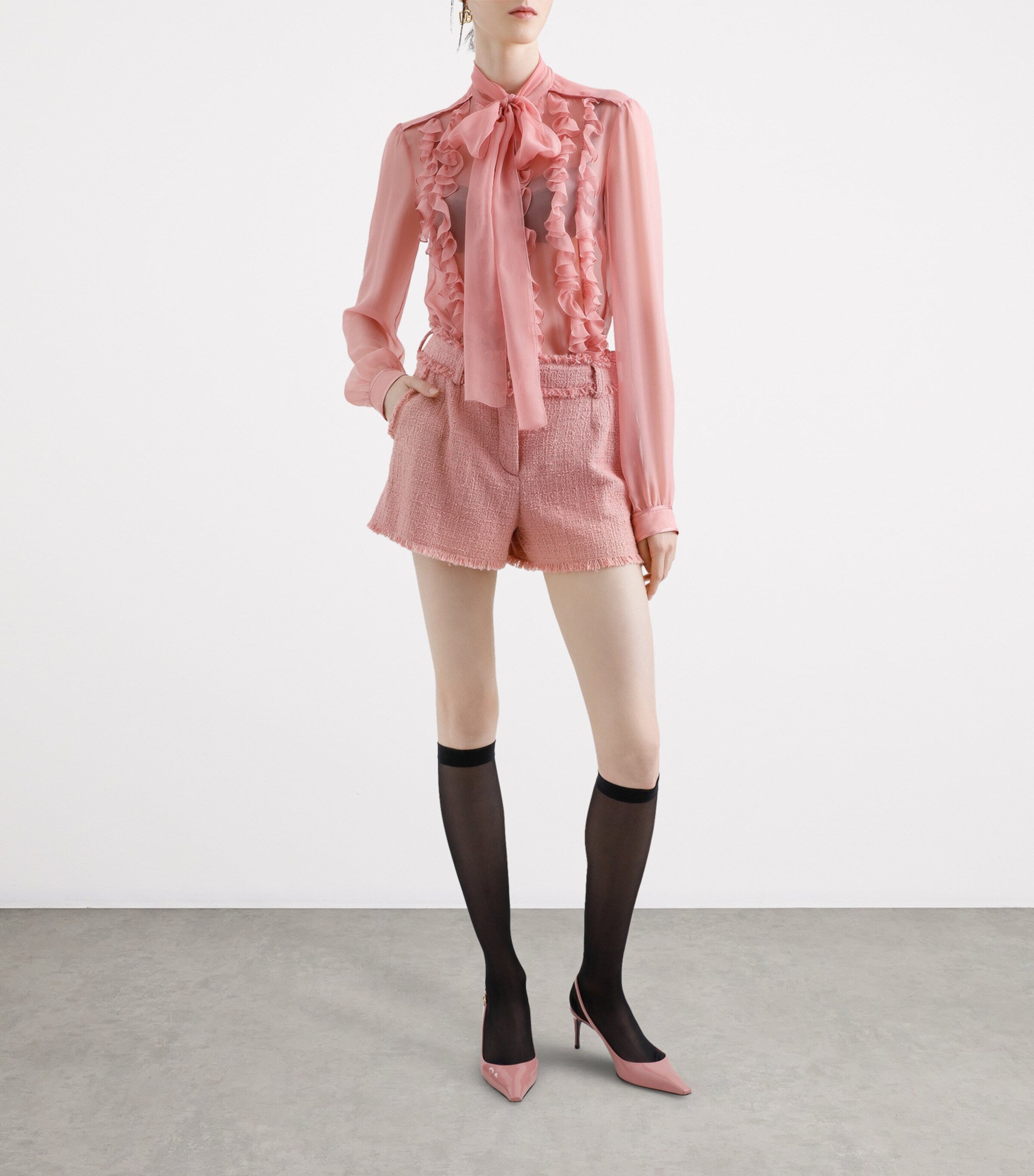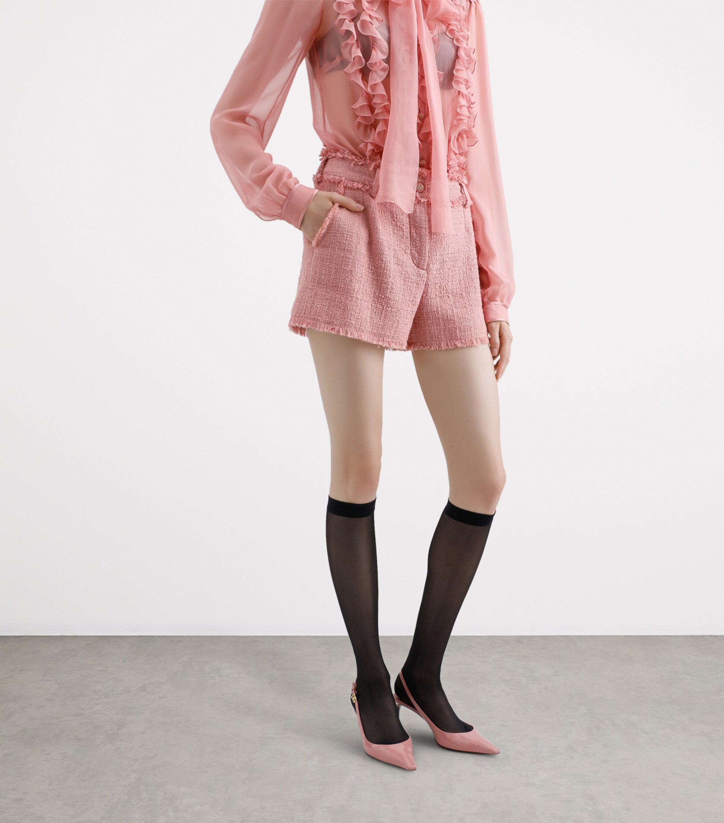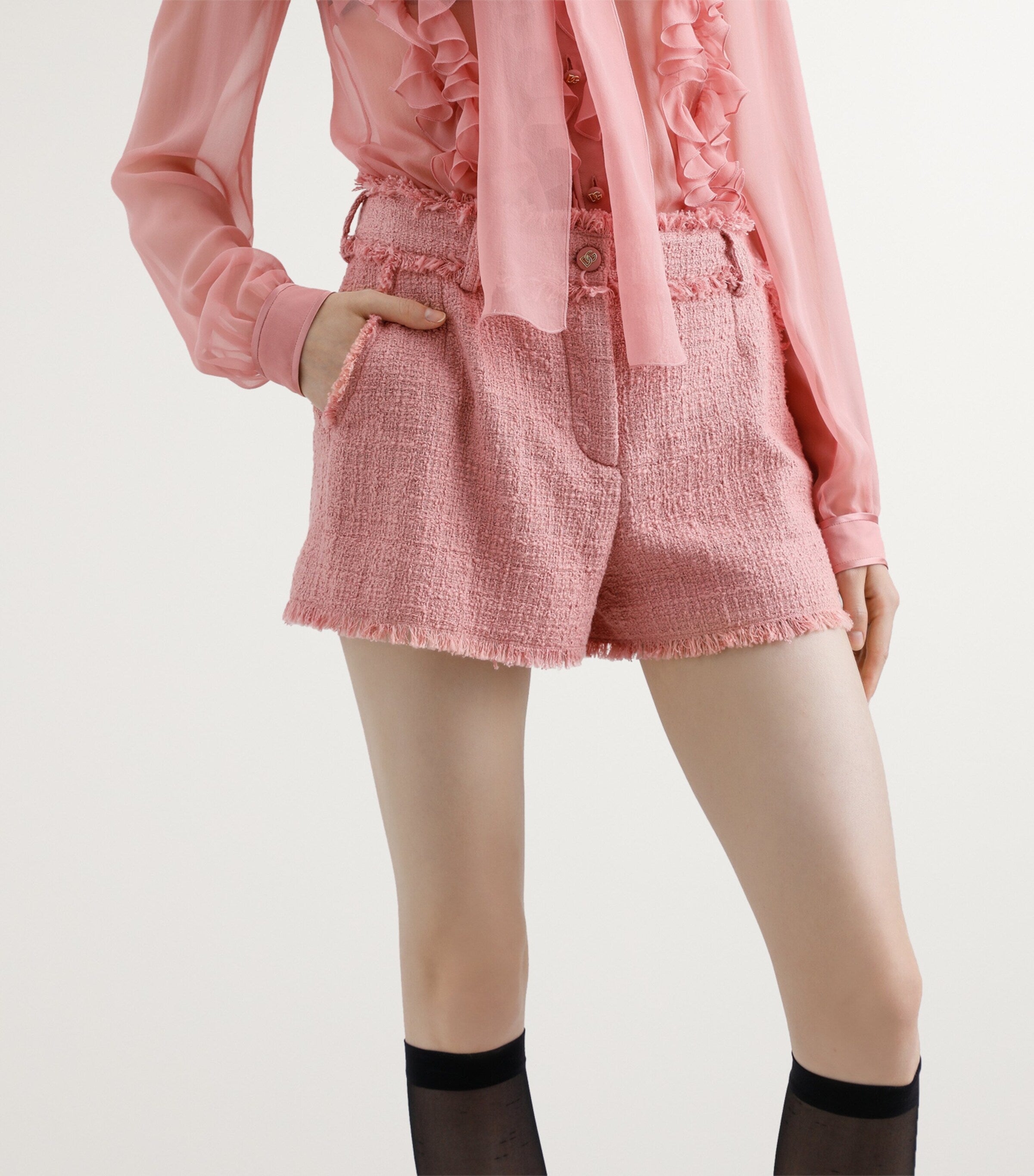 لطالما أثبتت دولتشي آند غابانا جدارتها كموردٍ للأسلوب الإيطالي الأصيل، مستلهمة من صقلية وثقافتها الغنية والمتنوعة. صُممت هذه الشورتات بلون وردي فاتح، ونسيجها التويدي مُطرّز قليلاً عند الحواف لإضفاء لمسة نهائية عتيقة.
