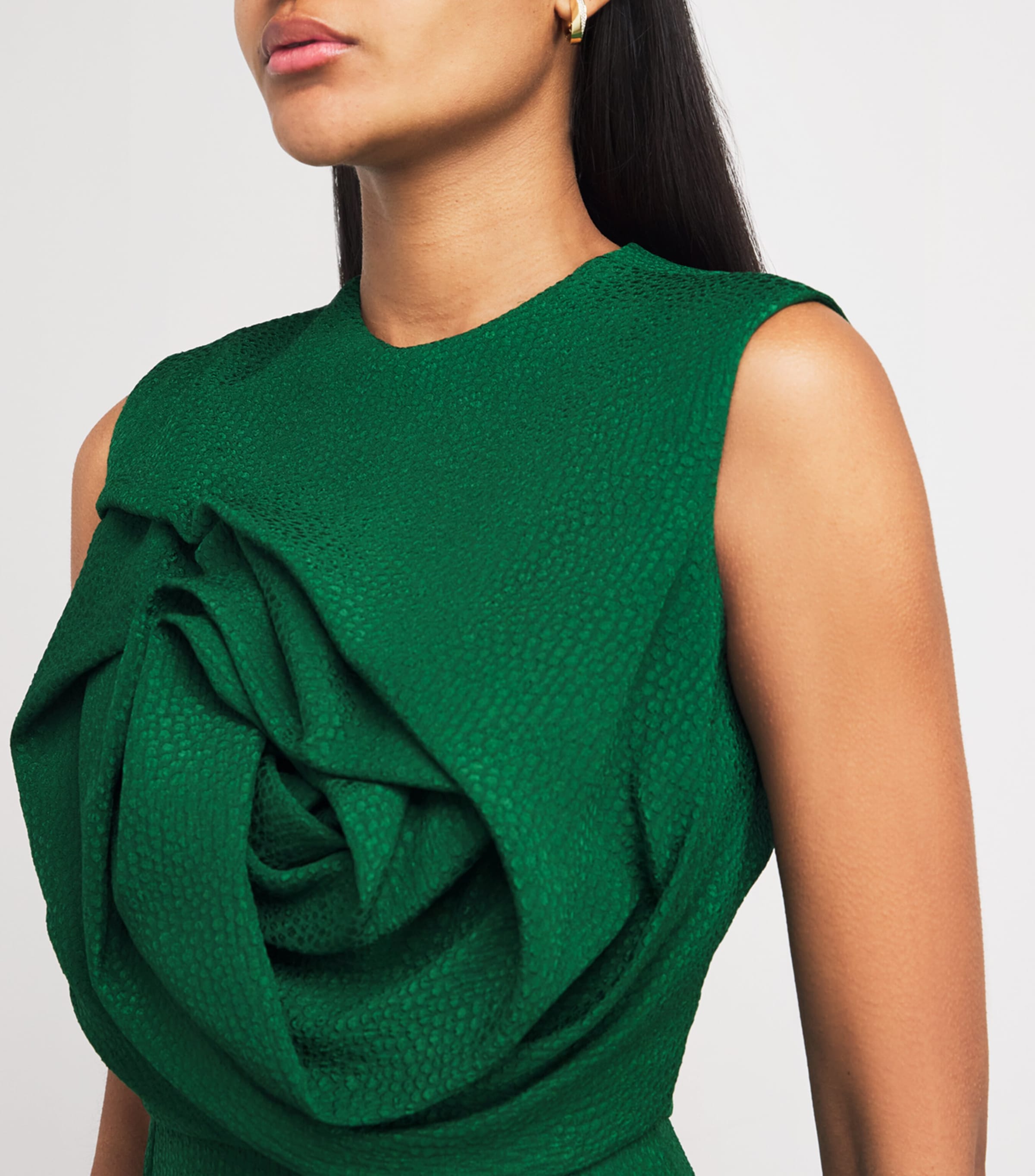 تُضفي إيدلين لي لمسةً من الإثارة على قطعها الخالدة، حيث تُبدع في التلاعب بالملمس من خلال قماش الجاكار المنفوش المميز لها، المنسوج في إيطاليا. هنا، تُضفي على فستان أفروديت متوسط ​​الطول ملمسًا ناعمًا كالحصى على القماش متوسط ​​الوزن، مُعززةً بذلك الطابع الأخّاذ الذي تُضفيه الثنيات الزهرية المنحوتة.
