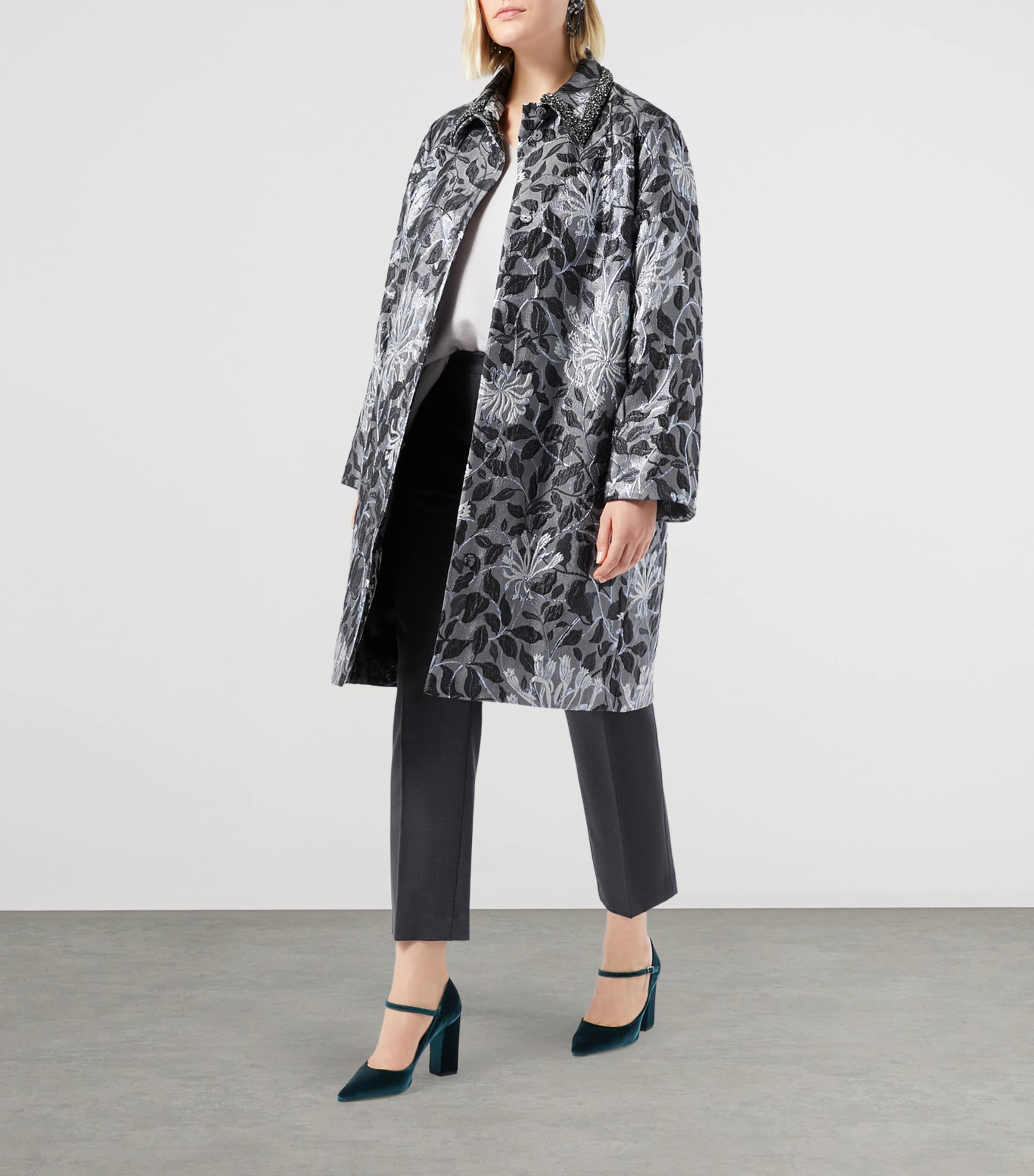 ثقي في مارينا رينالدي لتقدم لكِ أقمشة فاخرة وخياطة راقية. أي إطلالة رائعة تستحق طبقة خارجية متناسقة، فلماذا لا تختارين هذه القطعة المميزة من مارينا رينالدي؟ الخيوط المعدنية لقماش البروكار مُعززة بطبقة من الكريستالات تُحيط بالياقة، لتتألقي من كل زاوية.