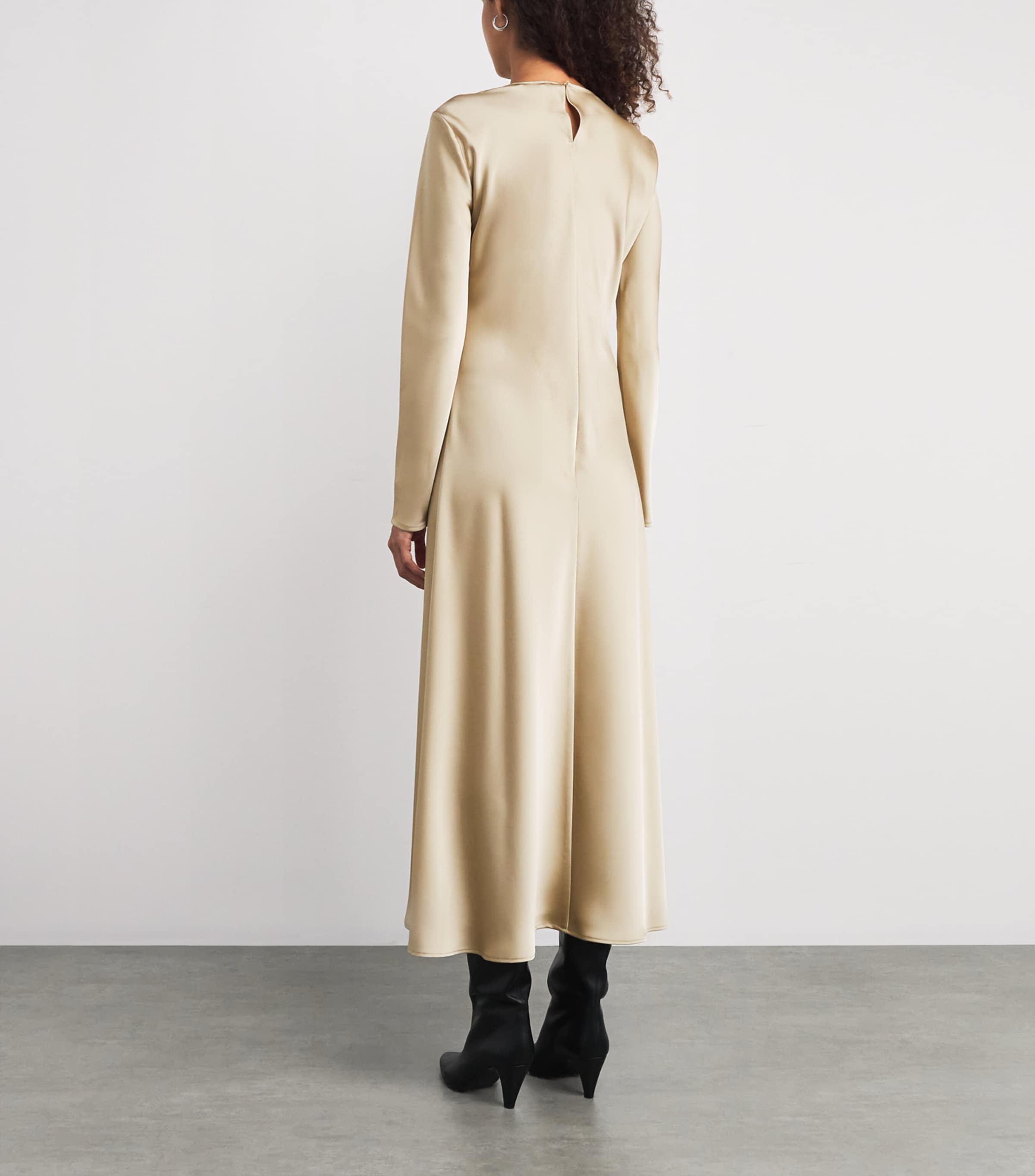 ماكس آند كو. علامة إيطالية تشتهر بقطعها الأساسية المصنوعة بحرفية عالية، والمصممة لتدوم طويلاً في خزانة ملابس عصرية. الساتان قماشٌ تتقنه العلامة التجارية، وهذا الفستان متوسط ​​الطول يُبرز خبرتها الإيطالية بتصميمه الأنيق والانسيابيّ وأكمامه الطويلة الأنيقة.