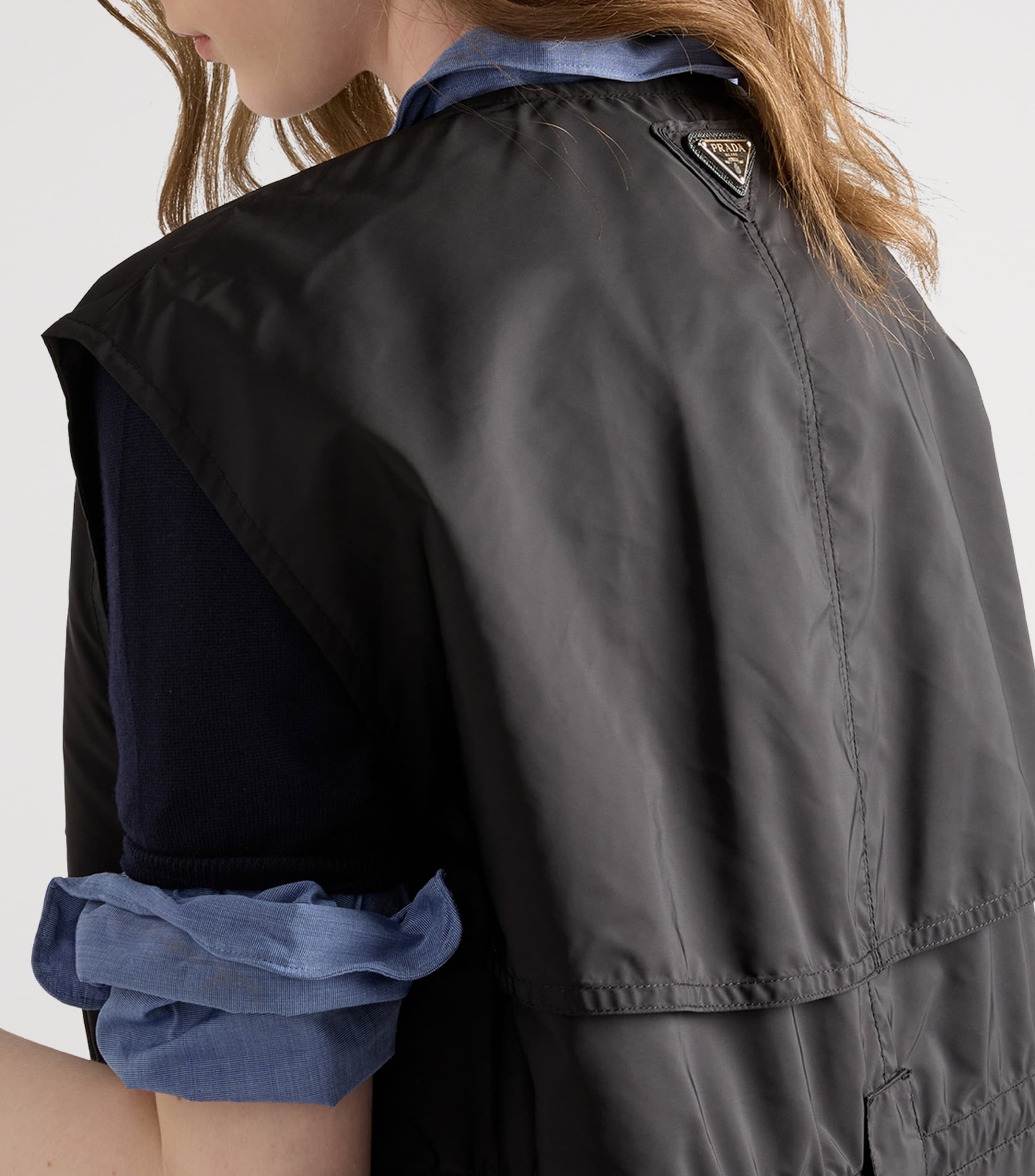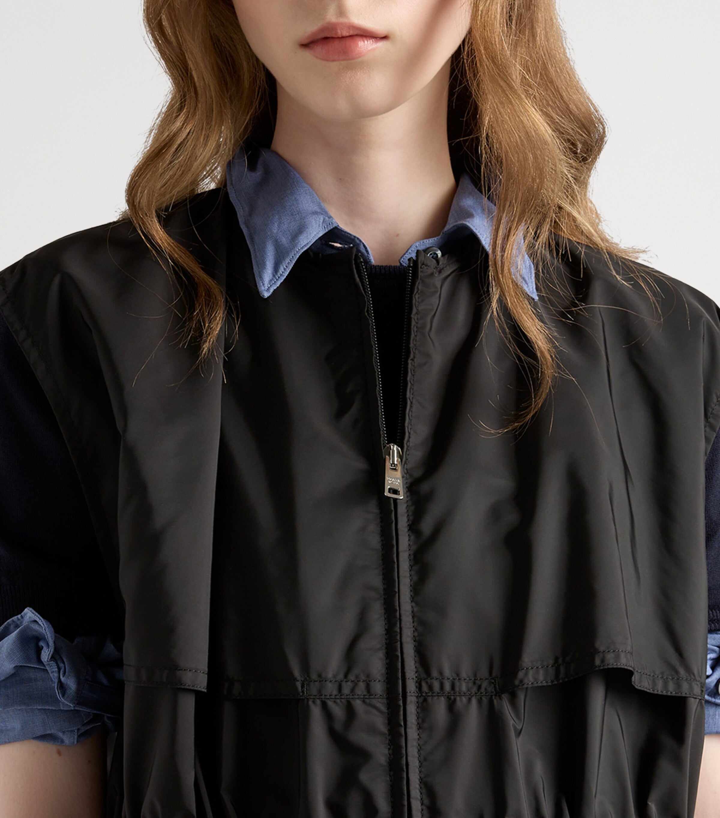 تُثبت برادا أن معاطفها وستراتها ليست وحدها التي يُمكن تحويلها باستخدام تقنية ري-نايلون المميزة، مع هذا الفستان القصير. المادة - المصنوعة من بلاستيك مُعاد تدويره من المحيط - تظهر هنا بتصميم مربع بدون أكمام، مع رباط للإغلاق على الخصر وسحاب ثنائي الاتجاه، مما يسمح لكِ بتخصيص مقاس التصميم بطرق لا تُحصى.