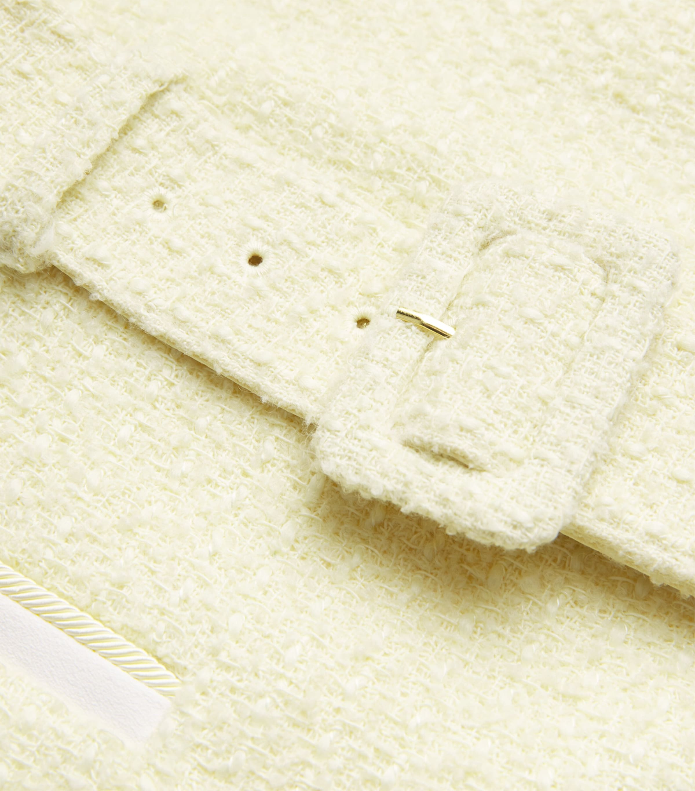 لون أصفر زبدي يُحيي ذكرى الستينيات: حقبة الفساتين القصيرة. أحدثت المقاسات القصيرة ثورة في عالم أزياء النساء، واحتفاءً بهذه النقلة التاريخية في عالم الموضة، تُقدم سيلف-بورتريت هذا الفستان القصير بألوان الباستيل. يتميز بتصميم كلاسيكي، مصنوع من قماش بوكليه مستوحى من الطراز القديم، ومُزين بحزام مستطيل الشكل يُمكنكِ تغييره ليناسب ذوقكِ.