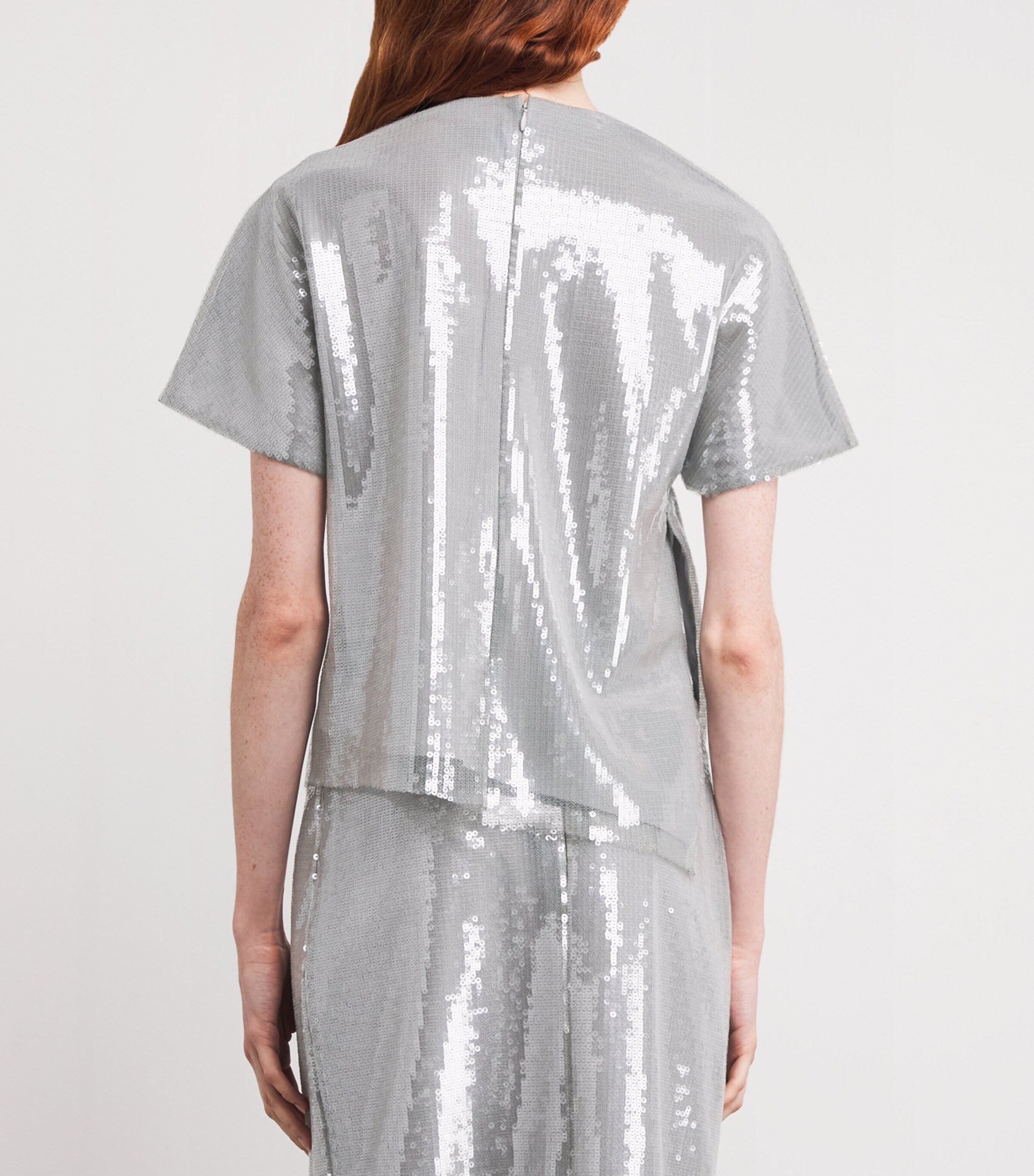 قد لا تكون بلوزة سامي من هويشان تشانغ الأولى التي تُزيّنها الترتر بالكامل، لكنها بلا شك من أكثرها لفتًا للانتباه. تصميمها الانسيابي ولمعانها اللانهائي يُضفيان عليها تأثيرًا يشبه الماء عند تحريكها، بينما تُضفي الزخارف الزهرية الرقيقة تباينًا أنثويًا ناعمًا.