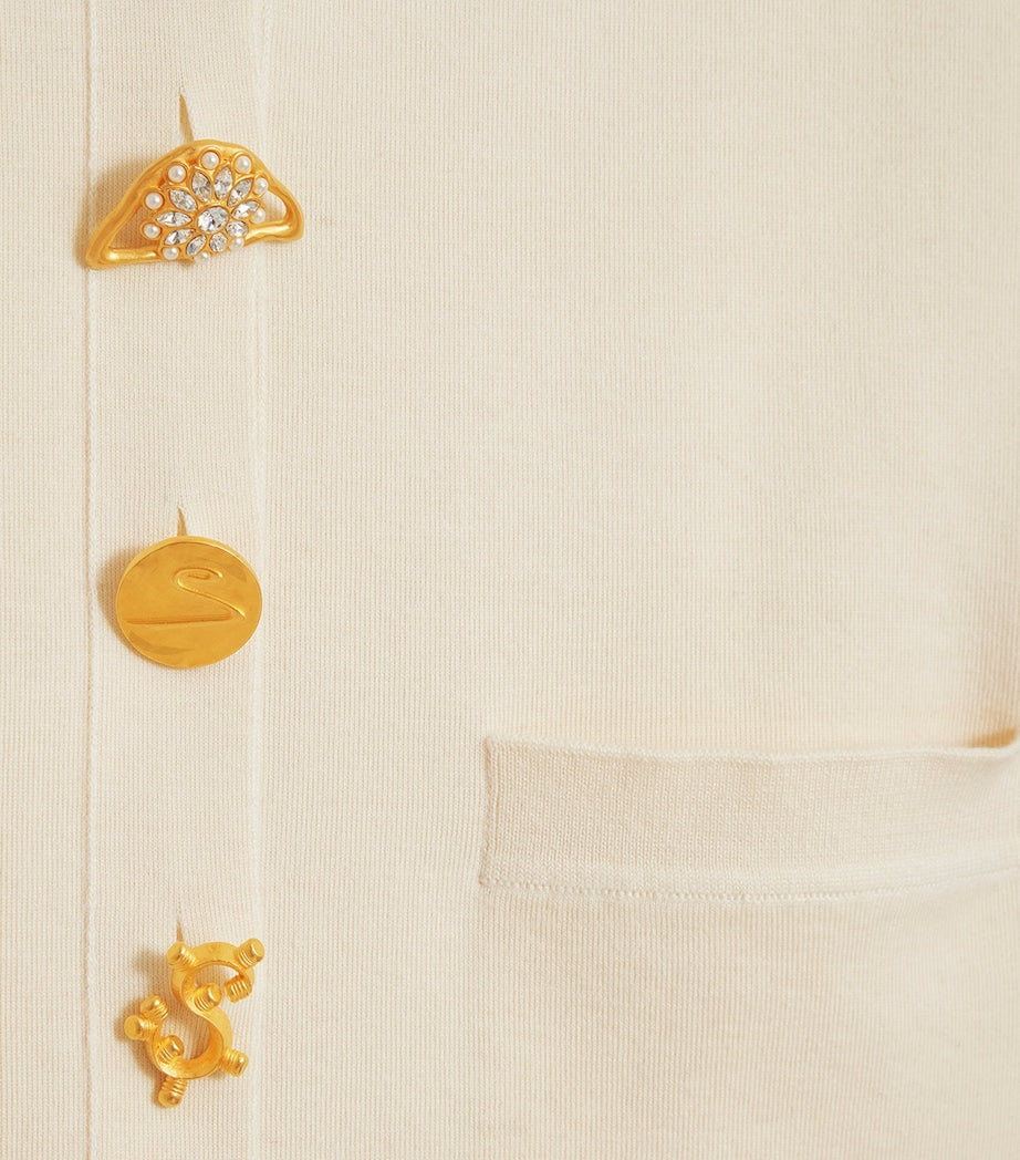 هذا الموسم، تُحوّل شياباريلي الكارديجان الكلاسيكي بفتحة رقبة على شكل حرف V إلى قطعة عصرية. يتميز كارديجان "أناتومي" بتشكيلة من أزرار المجوهرات البراقة، التي تُحاكي رموز الفن السريالي الفرنسي لإضفاء لمسة تاريخية. ارتديه فوق أحد فساتين دار الأزياء المزخرفة في المساء، أو أضف لمسة أنيقة إلى إطلالة عطلة نهاية الأسبوع مع مزيج الصوف الفاخر.