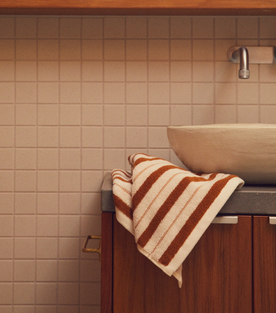 BAINA’s Lake House collection is inspired by the idea of interiors in places of retreat. Feelings of solitude and quiet contemplation are translated to its bath linens through earthen tones and classic stripes – not to mention the softness of Portuguese-crafted cotton used in pieces like the San Luis hand towel. The warm hues are inspired by thoughts of winter-ripened persimmons.