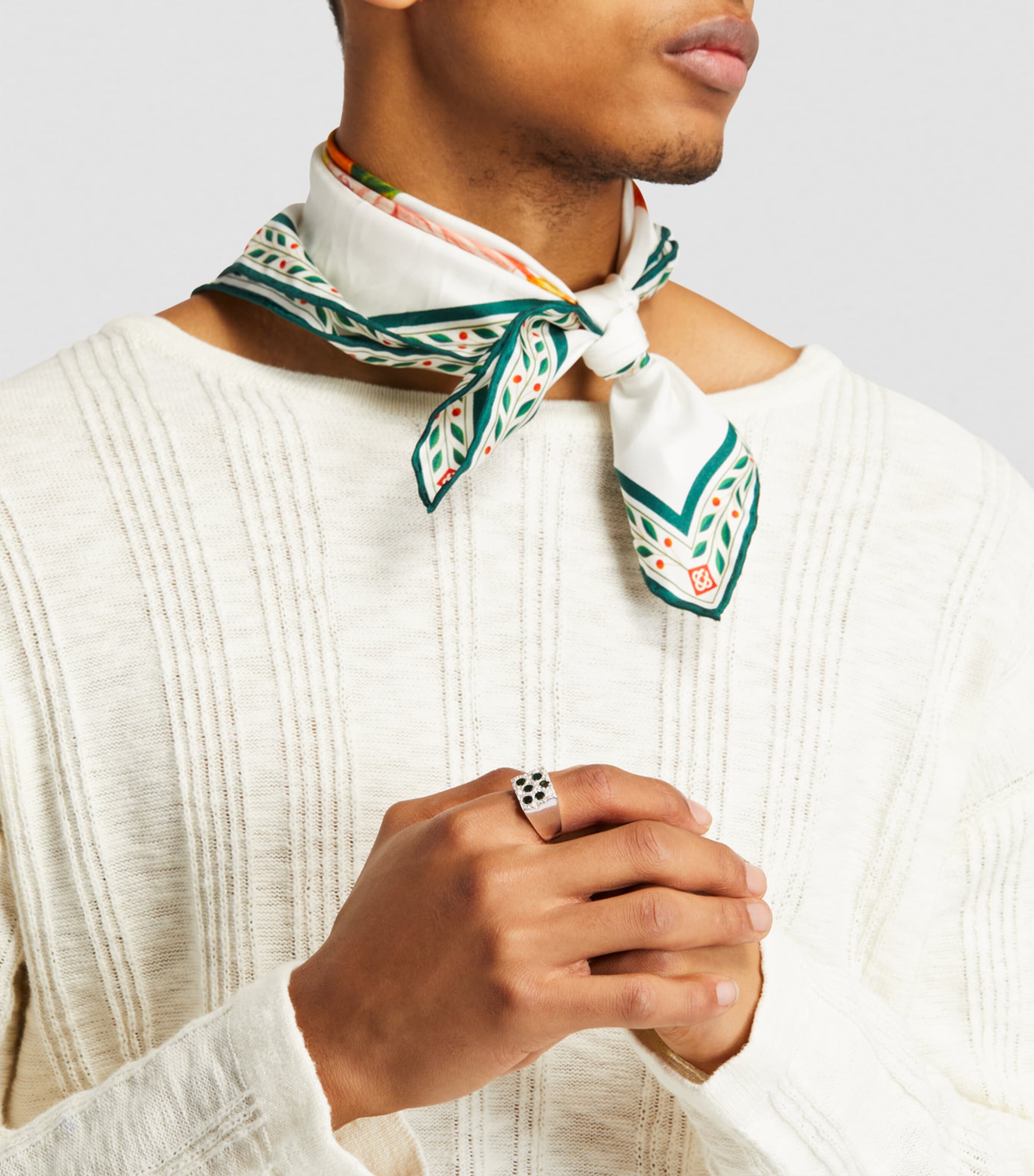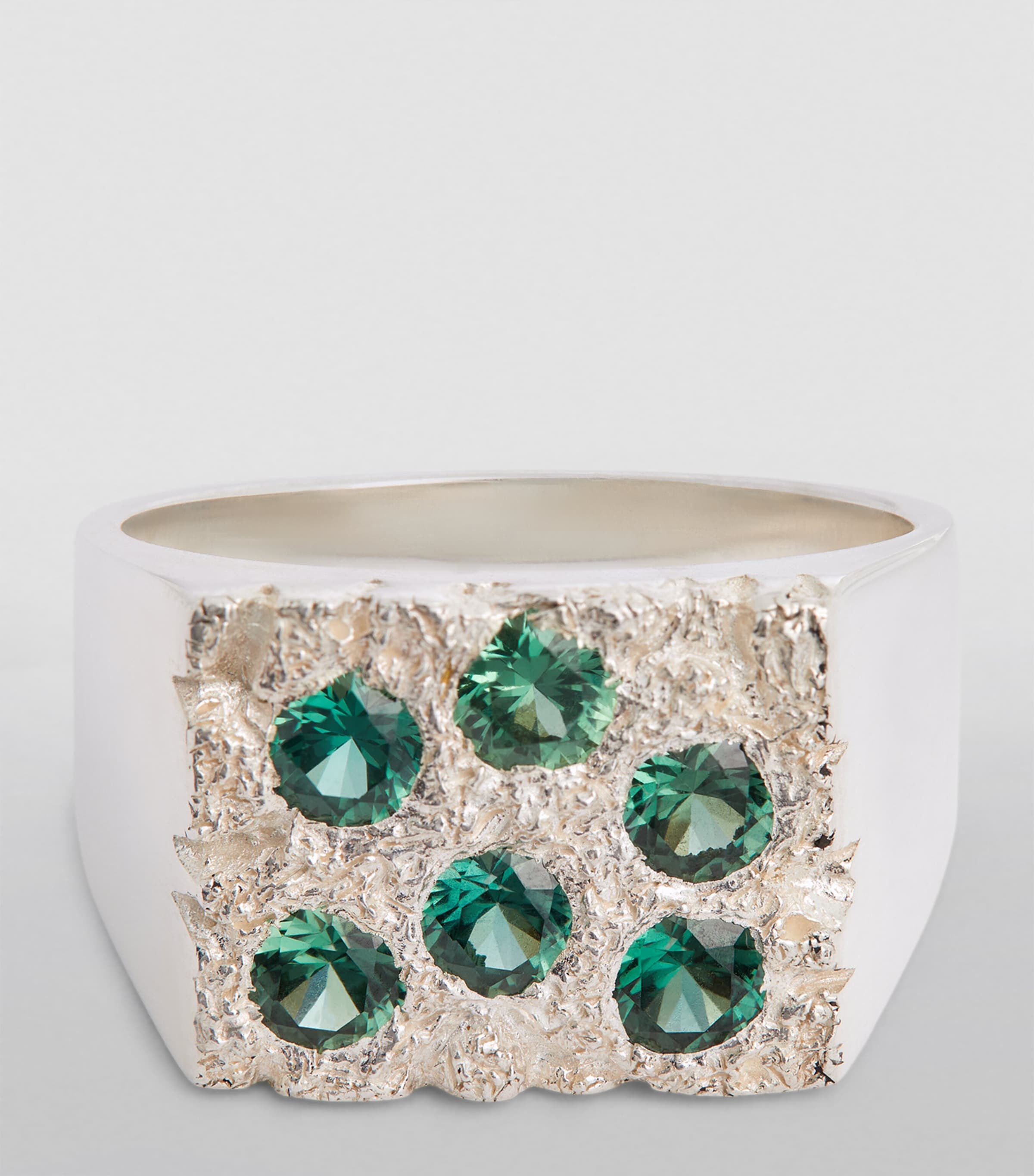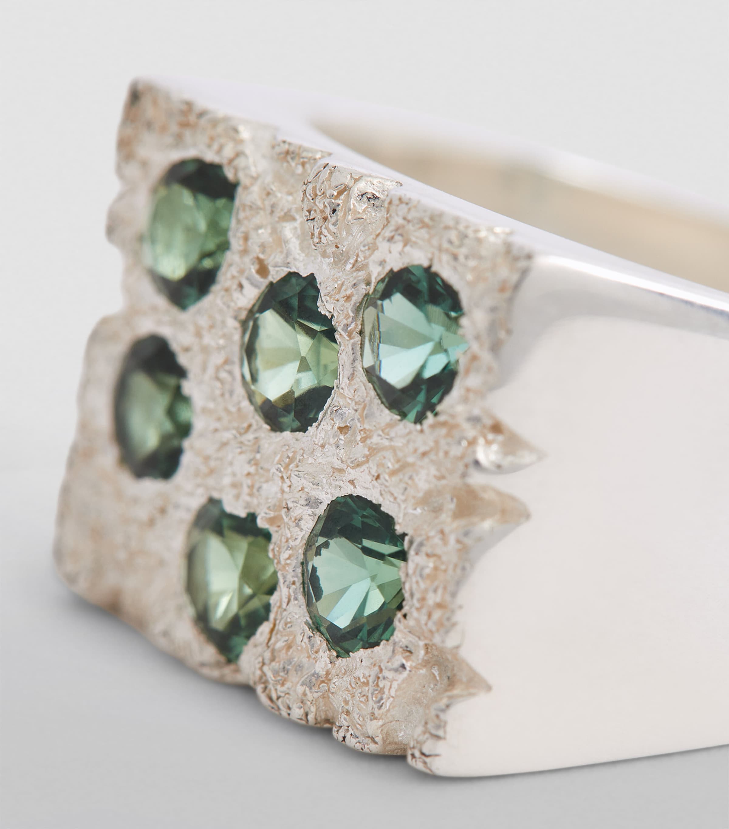 في حديقة الورود التقليدية، تُزرع كل وردة بنفس النوع وبمسافات متساوية، دون زراعة أي نوع آخر بينها، لخلق عرضٍ خلابٍ من الألوان في شهر يونيو. هذه الصورة هي التي ألهمت بلو بورنهام لتصميم خاتم "حديقة الورود"، وهو مصدر إلهامٍ متوقعٌ بالنظر إلى تركيز العلامة التجارية على عالم الطبيعة. هذه القطعة الحصرية مصنوعة من الفضة الإسترلينية، وتتميز بستة أحجار زمرد موزعة بالتساوي ضمن نسيجٍ يُحاكي أوراق الشجر.
