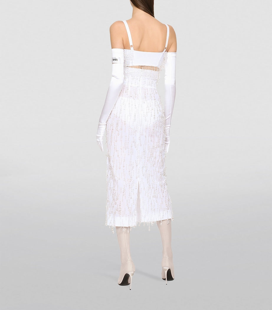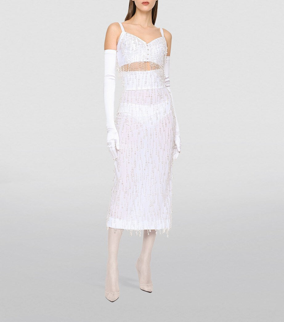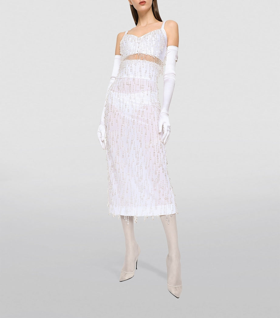 بعد عام واحد بالضبط من انطلاق علامة دولتشي آند غابانا عام ١٩٨٥، أطلقت العلامة خطّها الخاص من الملابس الداخلية، ولا تزال الملابس الداخلية تُشكّل جزءًا أساسيًا من تصميم مجموعات العلامة التجارية حتى يومنا هذا. في إطار تعاونها الحصري مع كيم كارداشيان، تتميز هذه الصدرية بخرز شفاف يتدلّى من تصميمها ليمنحها لمسةً من الفخامة، لتبدو وكأنّكِ خرجتِ للتوّ من بركةٍ من الألماس.