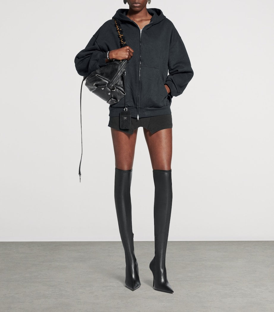 بقصّة أنيقة وعصرية، وراحة تامة، يُعيد هذا الهودي المصنوع من القطن والصوف الجاف تعريف أساسيات الحياة اليومية من خلال عدسات بالنسياغا. أكتاف منسدلة وقلنسوة بدون رباط تُضفي شكلاً مريحاً، بينما يُضفي الشعار المقلوب على الظهر لمسةً من التمرد على التصميم البسيط.