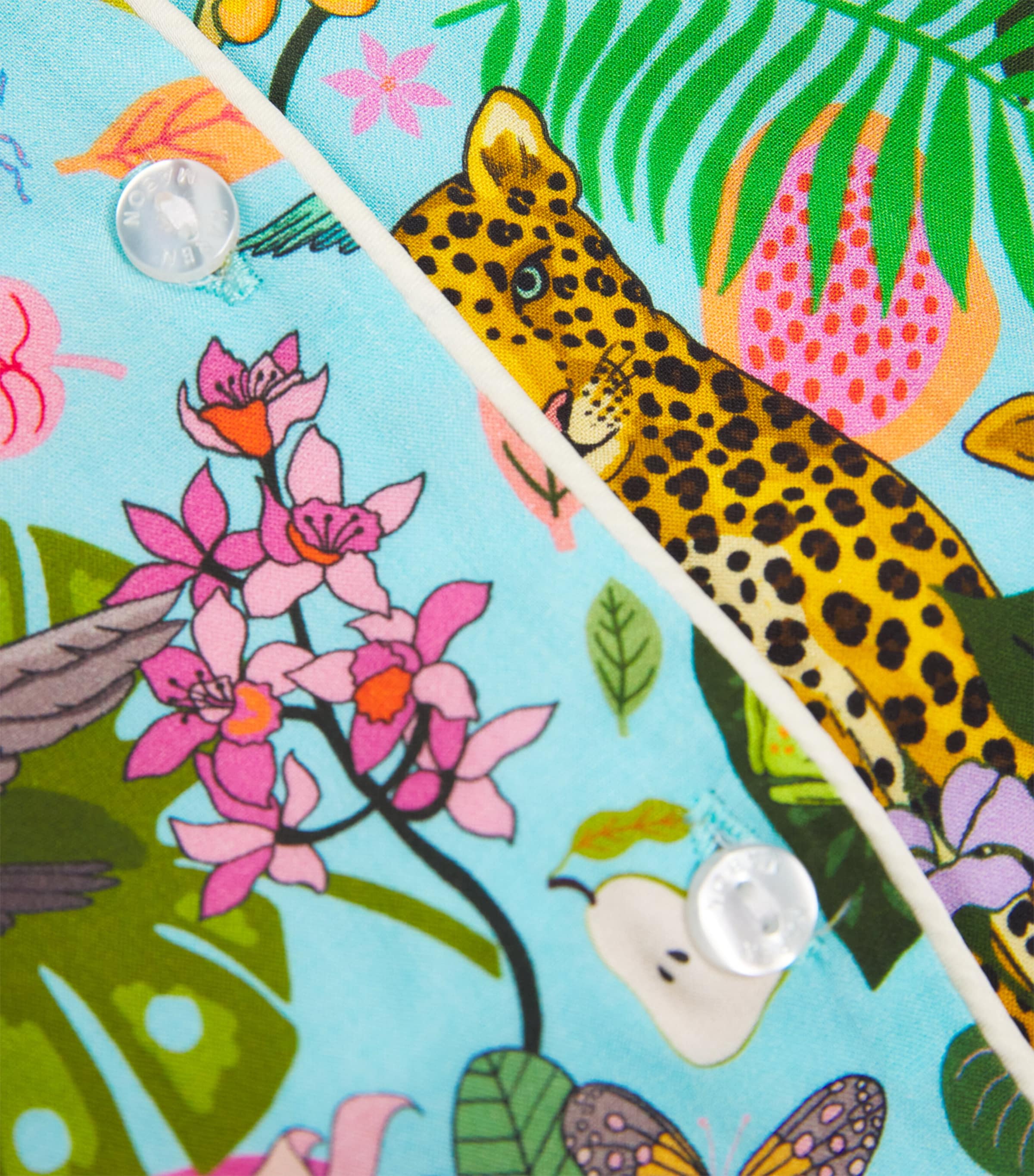 Infusing bedtime with a wild sense of adventure, this delightful pyjama set is constructed from sumptuously comfortable fabric and covered in a highly detailed, tropical print. The long-sleeve top features classic piping and a camp collar, complementing the straight-leg trousers for complete comfort.
