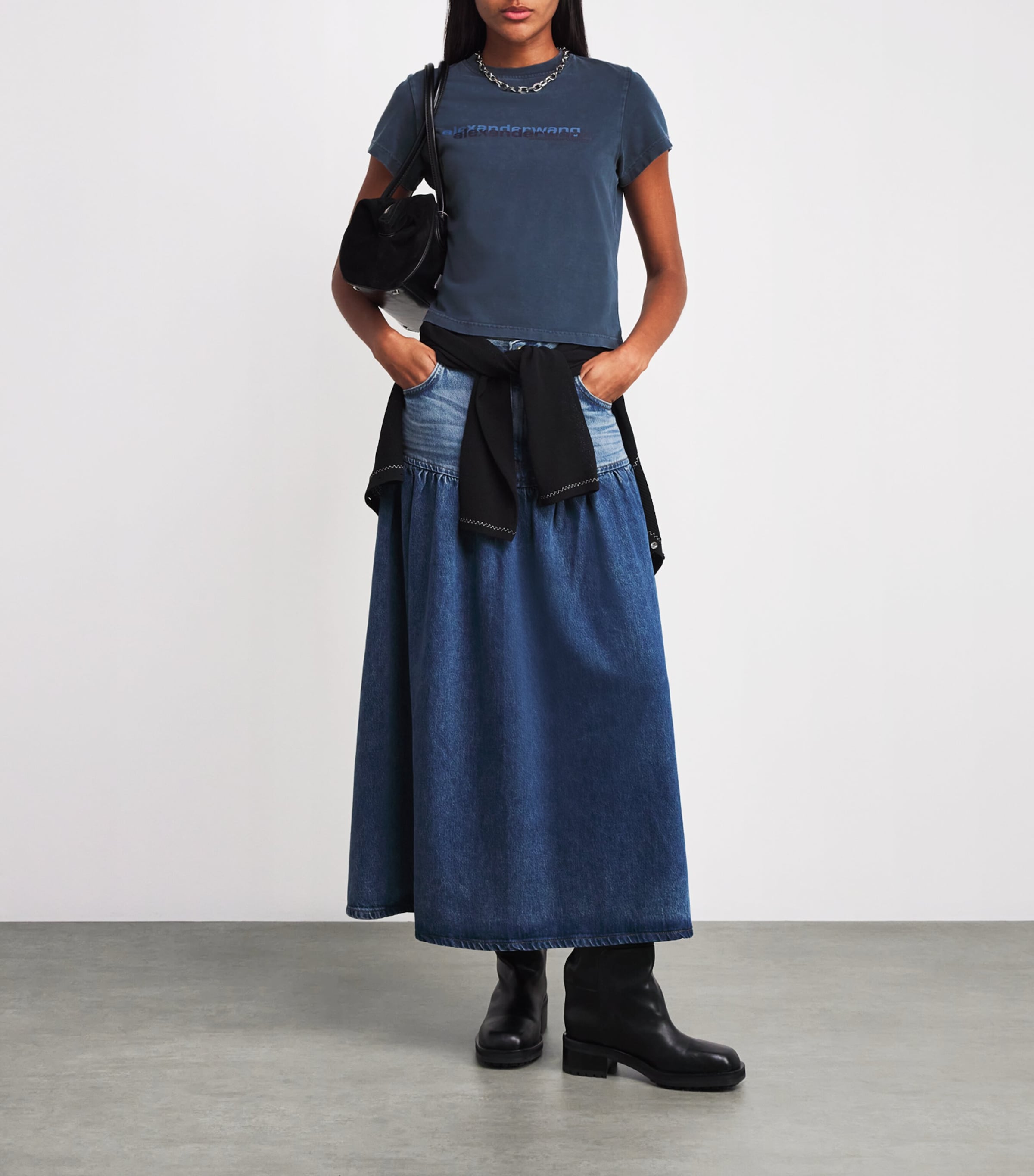 تي شيرت قطني أزرق داكن بشعار - 421b البحرية المغسولة / XXS