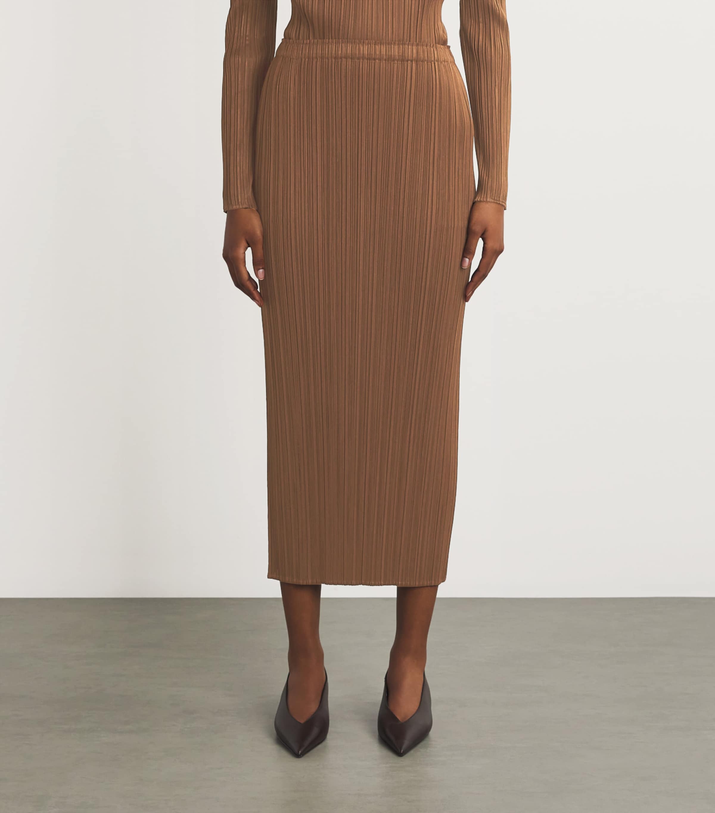 يُتيح الشريط المطاطي للقطعة أن تستقر بشكل مريح حول الخصر. أتقنت علامة Pleats Please Issey Miyake فن مزج الراحة مع الأناقة من خلال قماشها المطوي المميز، مما أدى إلى مجموعات خالدة مثل مجموعة New Colourful Basics. صُنعت هذه التنورة متوسطة الطول من خيط واحد، مما يسمح لها بالحفاظ على مرونة فائقة مع الحفاظ على مظهر أنيق وراقي.