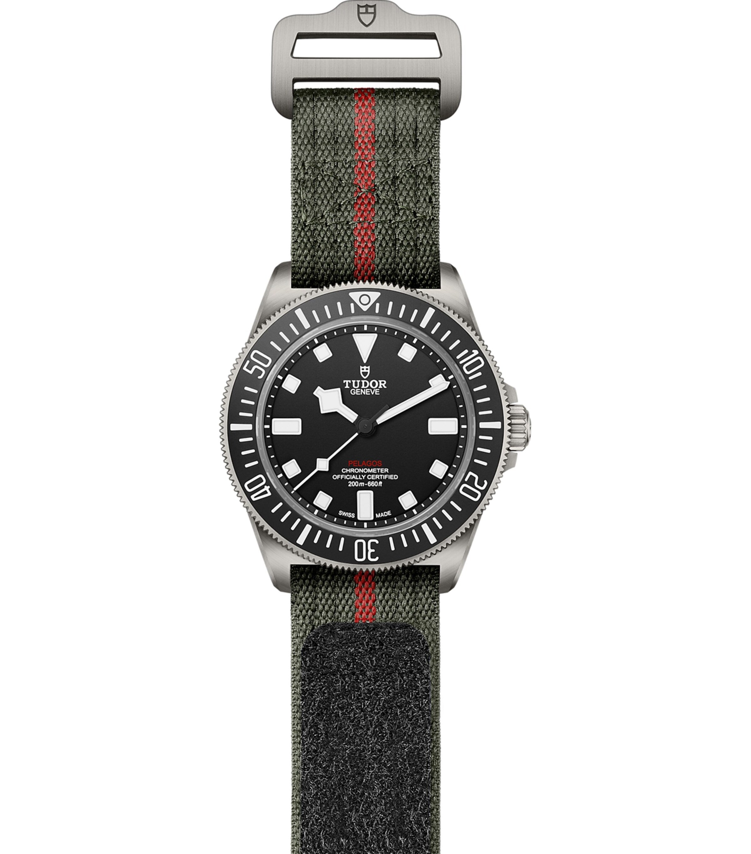 Steeped in military history, the TUDOR Pelagos FXD watch has been crafted in satin-brushed titanium for its latest reincarnation. Whether you're a fearless seafarer with a love for the open water or an expert diver, this modern 'Milsub' is ready for any adventure with an impressive 200 metres of water resistance. Other noteworthy details include its signature fixed strap bars for superior robustness and reliability, ergonomic 60-click rotating bezel and square hour markers and angular hands – better known as 'Snowflake hands' – that allow for maximum legibility in dark settings.