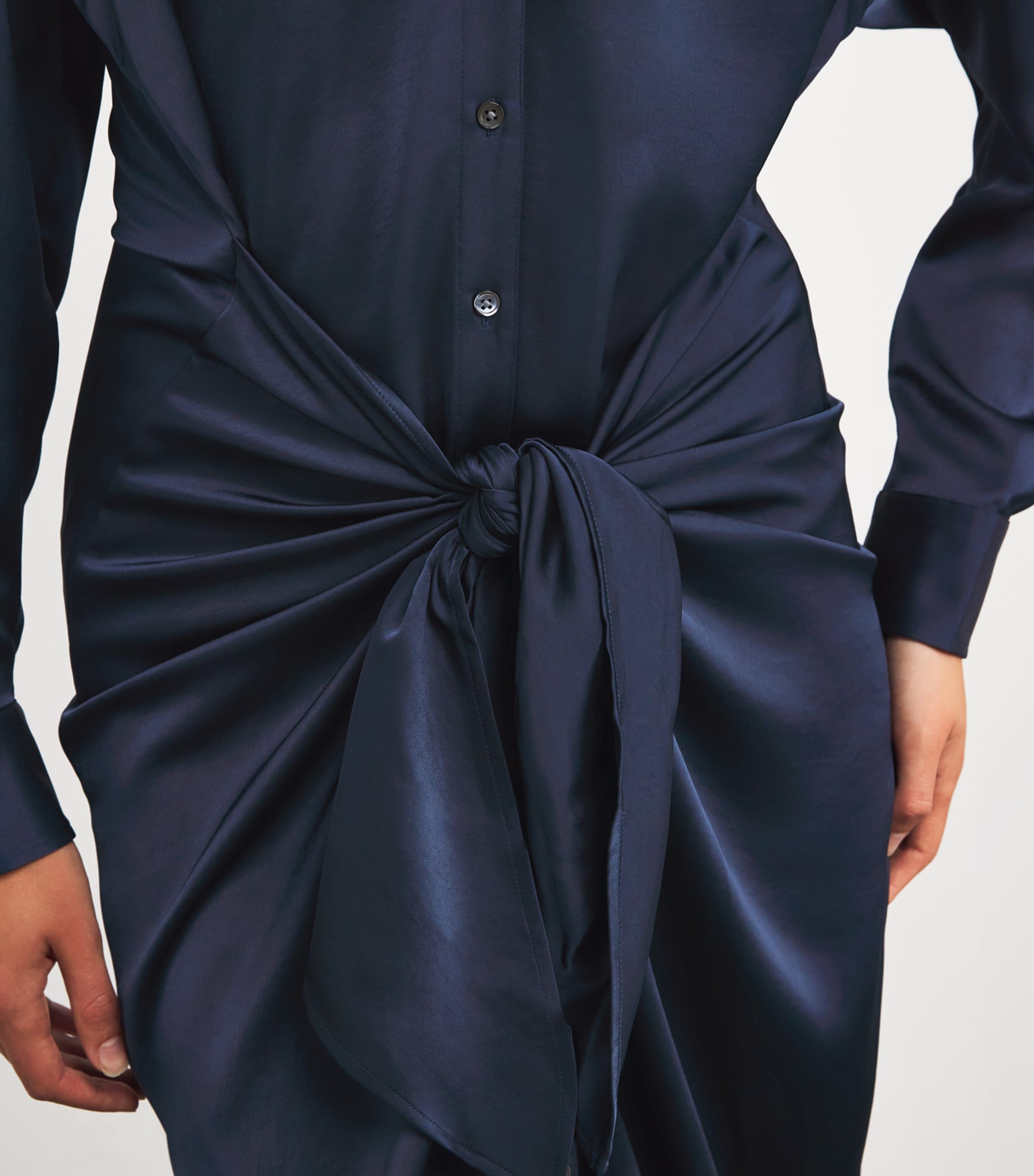 براعةٌ في عالم الأقمشة. تُسلّط بولو رالف لورين الضوء على انسيابية ساتانها اللامع المُعاد تدويره بإضافة أربطة فضفاضة على حزام هذا الفستان متوسط ​​الطول. تُبرز قدرة العلامة التجارية الفطرية على دمج وإعادة ابتكار الفساتين التقليدية عناصر من أنماط القمصان واللفائف والفساتين المنسدلة لتُشكّل هذه القطعة الأنيقة.