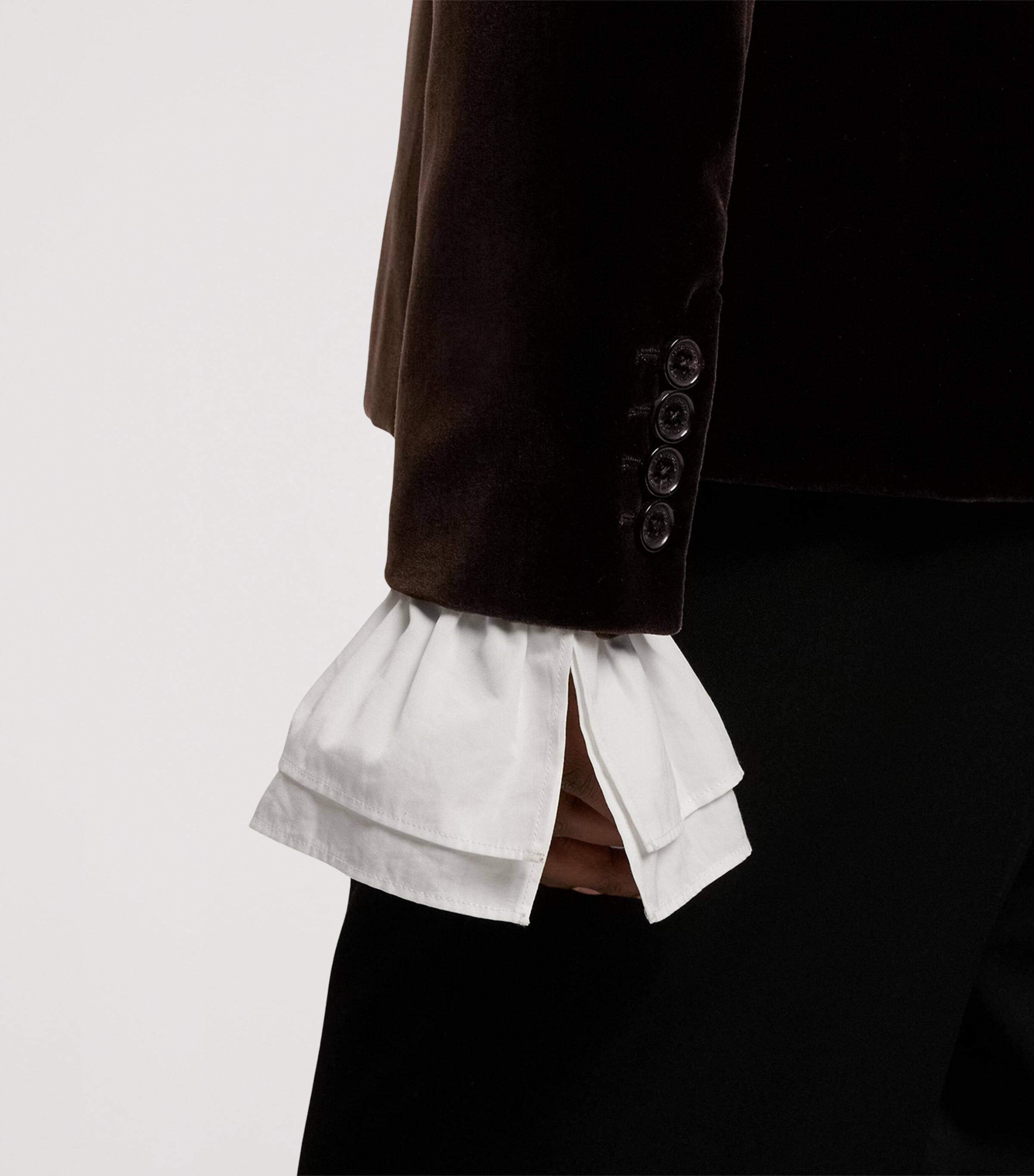 صُنعت سترة بليزر باركر من مجموعة رالف لورين من مخمل مرن خفيف الوزن في إيطاليا، وتتميز بانسيابية تصميمها، وتحافظ على شكلها النحيف الذي يُبرز الخصر مع تكرار ارتدائها. تُضفي الجيوب المزخرفة لمسةً هندسية عملية، بينما تُضفي أزرار القرن الأصلية لمسةً نهائيةً عريقة، تُضفي لمسةً عصريةً على الخياطة بلمساتٍ مستوحاة من الفروسية.