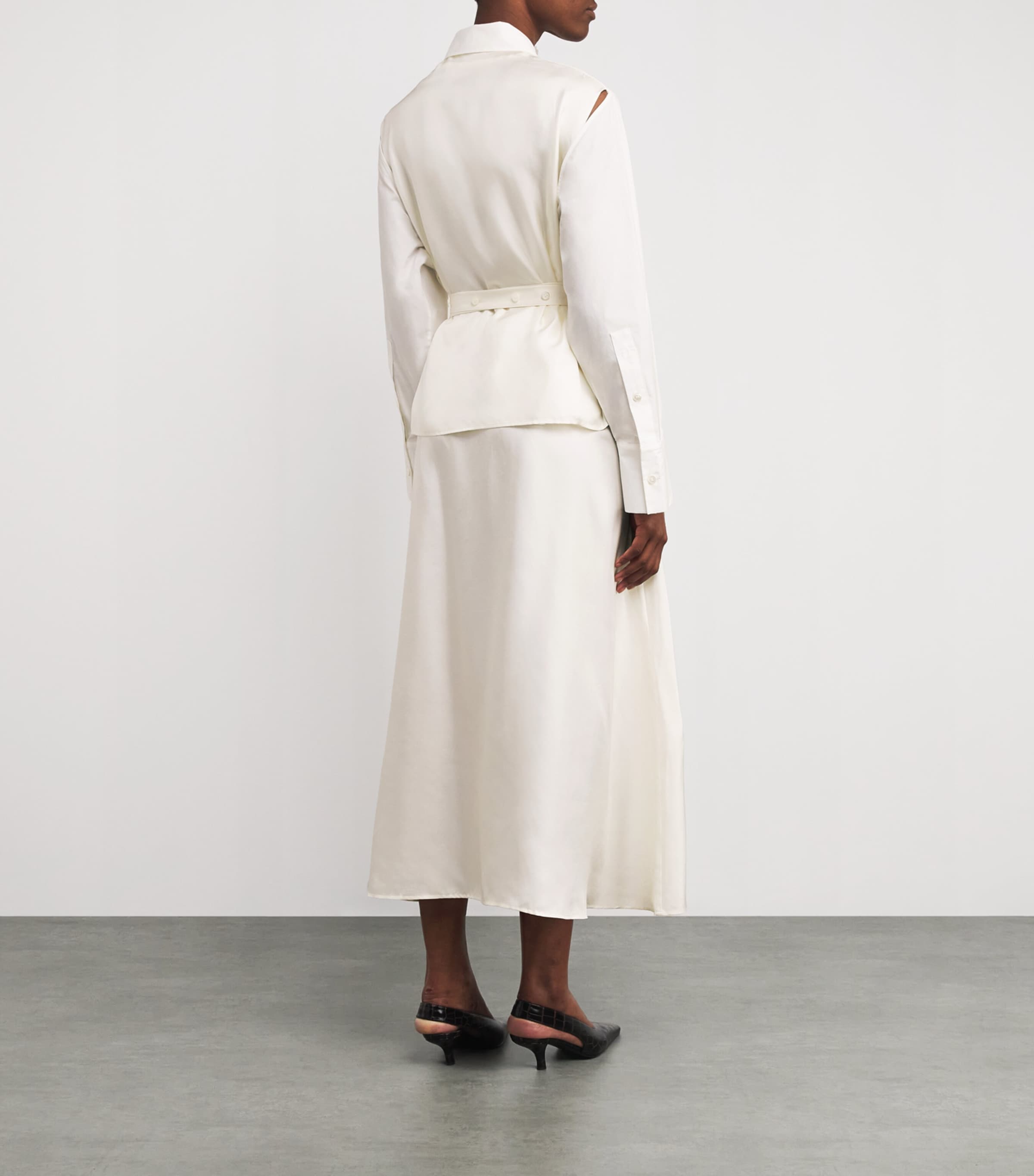 يُضفي هذا الفستان الميدي لمسةً من التفرد والإبداع على تصميمه القابل للتكيف. يتميز تصميمه المُفكك - الذي يتكون من صدرية من قماش البوبلين القطني وتنورة من الساتان الحريري - بفتحات عند الذراع وحزام ملفوف بأزرار لخيارات تنسيق متنوعة.