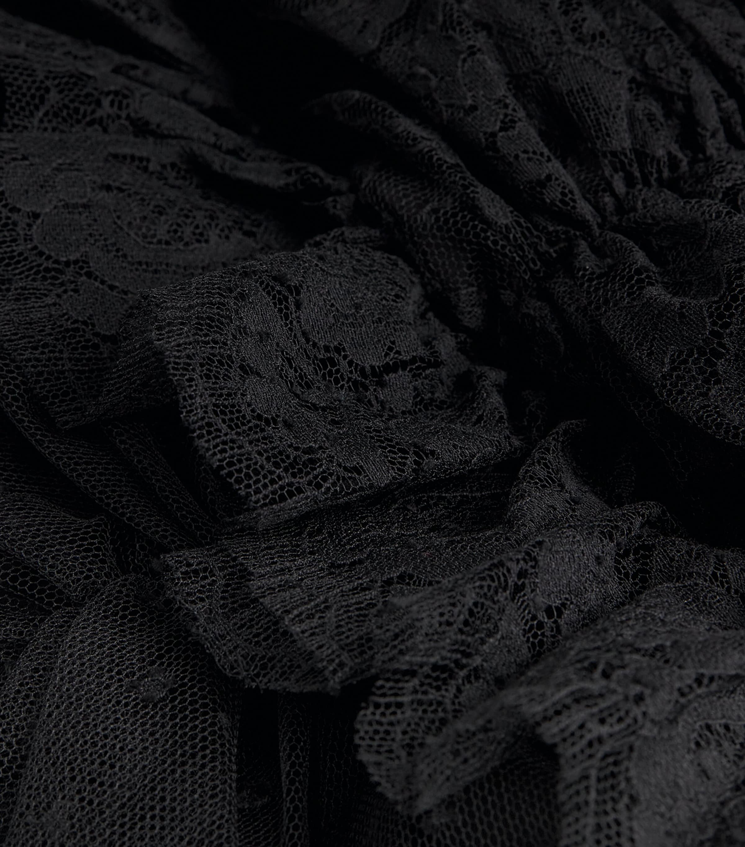 بلمسة عصرية مستوحاة من حكايات أليس في بلاد العجائب، أضفت مجموعة أليساندرا ريتش لخريف وشتاء 2025 لمسة رومانسية على المرأة العصرية الساذجة. يُعد هذا الفستان الماكسي من أكثر القطع جرأةً في المجموعة؛ بتصميمه المفتوح المصنوع من قماش ناعم مكشكش يُذكرنا بالفستان الأسود القصير، وطبقة خارجية واسعة من الدانتيل الأسود المزهر تُجسّد توجهات العلامة المستوحاة من أسلوب الريترو.