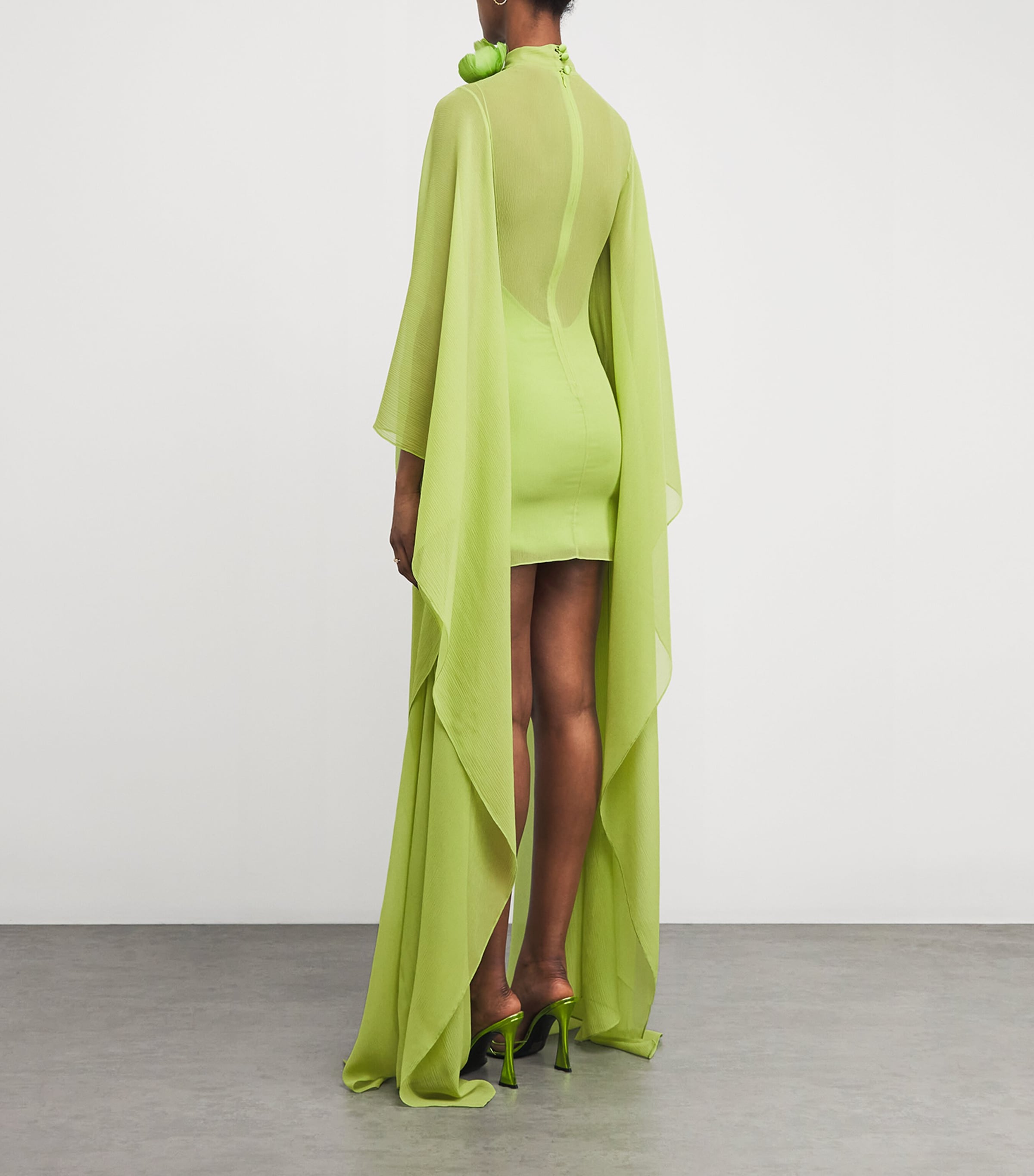 تُعدّ التصاميم المُنسدلة من اختصاص تالر مارمو، مما يجعلها خيارًا شائعًا لعشاق الموضة الراغبين في الظهور بإطلالة أنيقة. هنا، اختارت العلامة شيفونًا حريريًا رقيقًا لإطلالة قفطان لانزاروتي جاردن القصير، الذي ينساب فوق بطانة انزلاقية بلون باهت وصولًا إلى الأكمام الطويلة.
