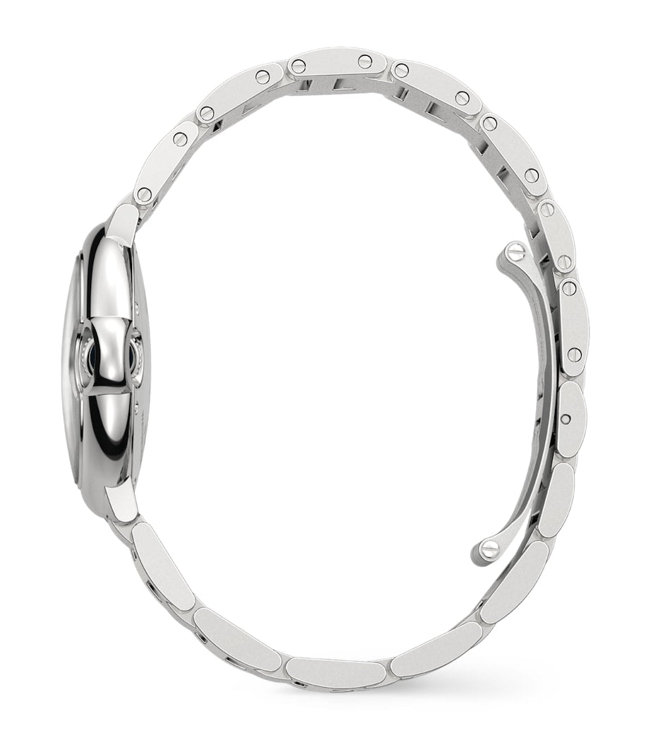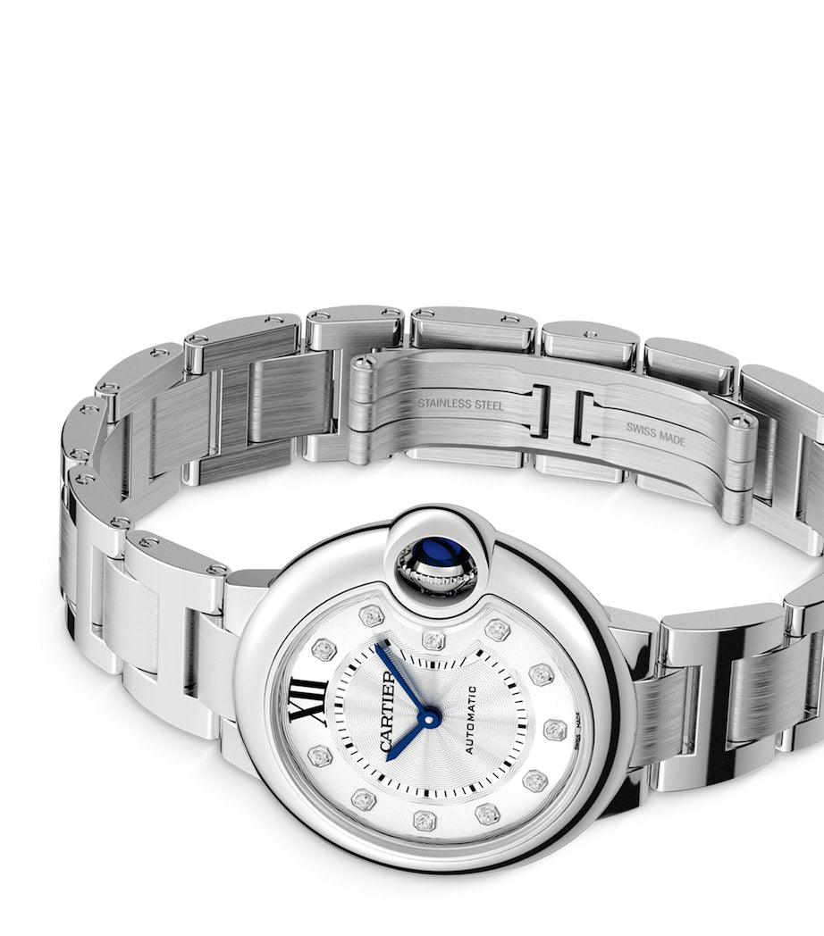 ساعة كارتييه بالون بلو المصنوعة من الفولاذ المقاوم للصدأ والمرصعة بالألماس، مقاس 33 مم
