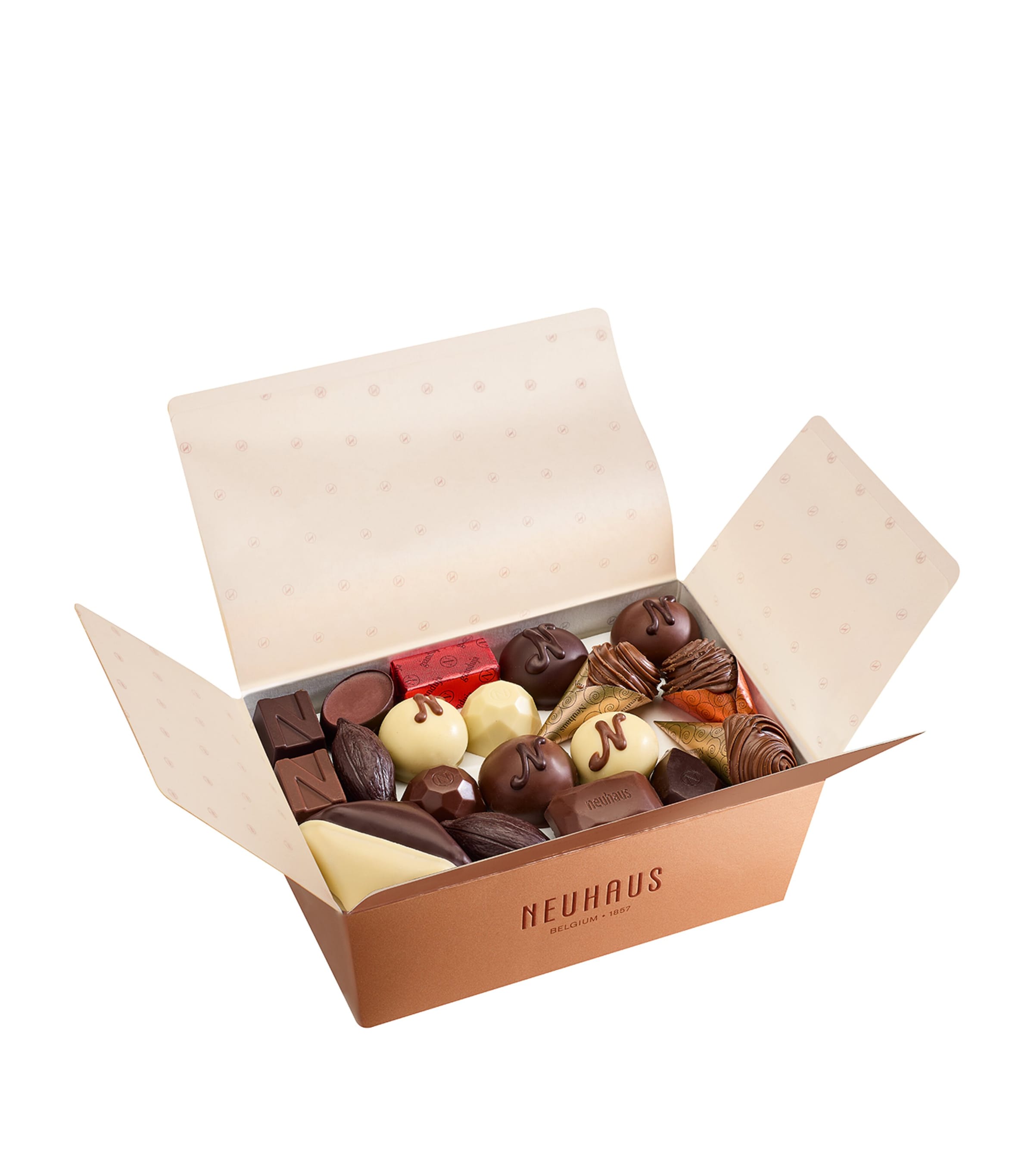 In 1915, a moment of inspiration struck Louise Agostini, Jean Neuhaus Jr’s wife, who came up with an elegant gift box to present Neuhaus’ chocolates and protect them on their journey from gift-giver to giftee. Thus was borne the Ballotin – a Belgian tradition that continues to this day. This one – dubbed The Timeless Masterpieces – is filled with a selection of fresh cream, praliné, ganache and gianduja filled pralines, all of 100% natural origin.