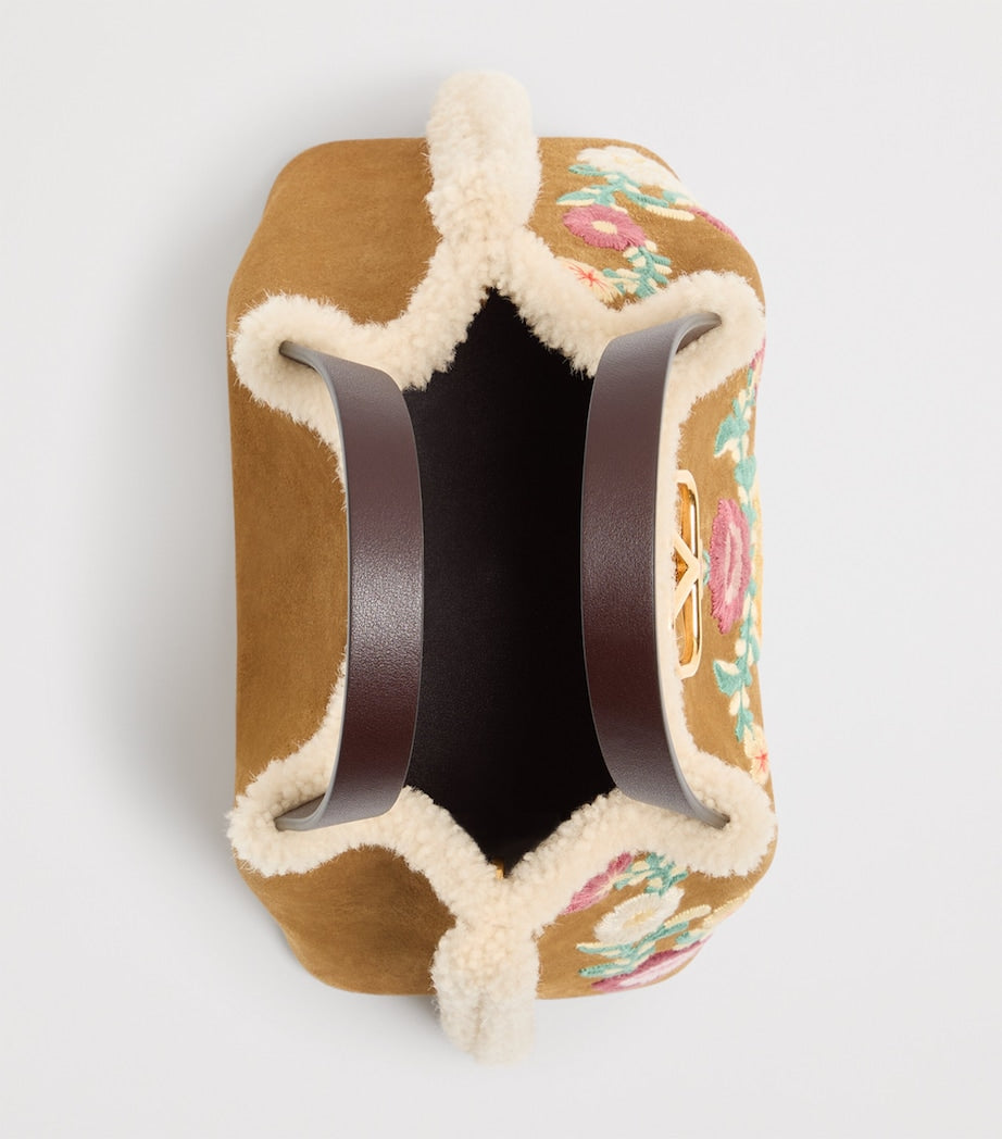 حقيبة فالنتينو جارافاني صغيرة من جلد الغزال باللون البيج ومزينة بالزهور