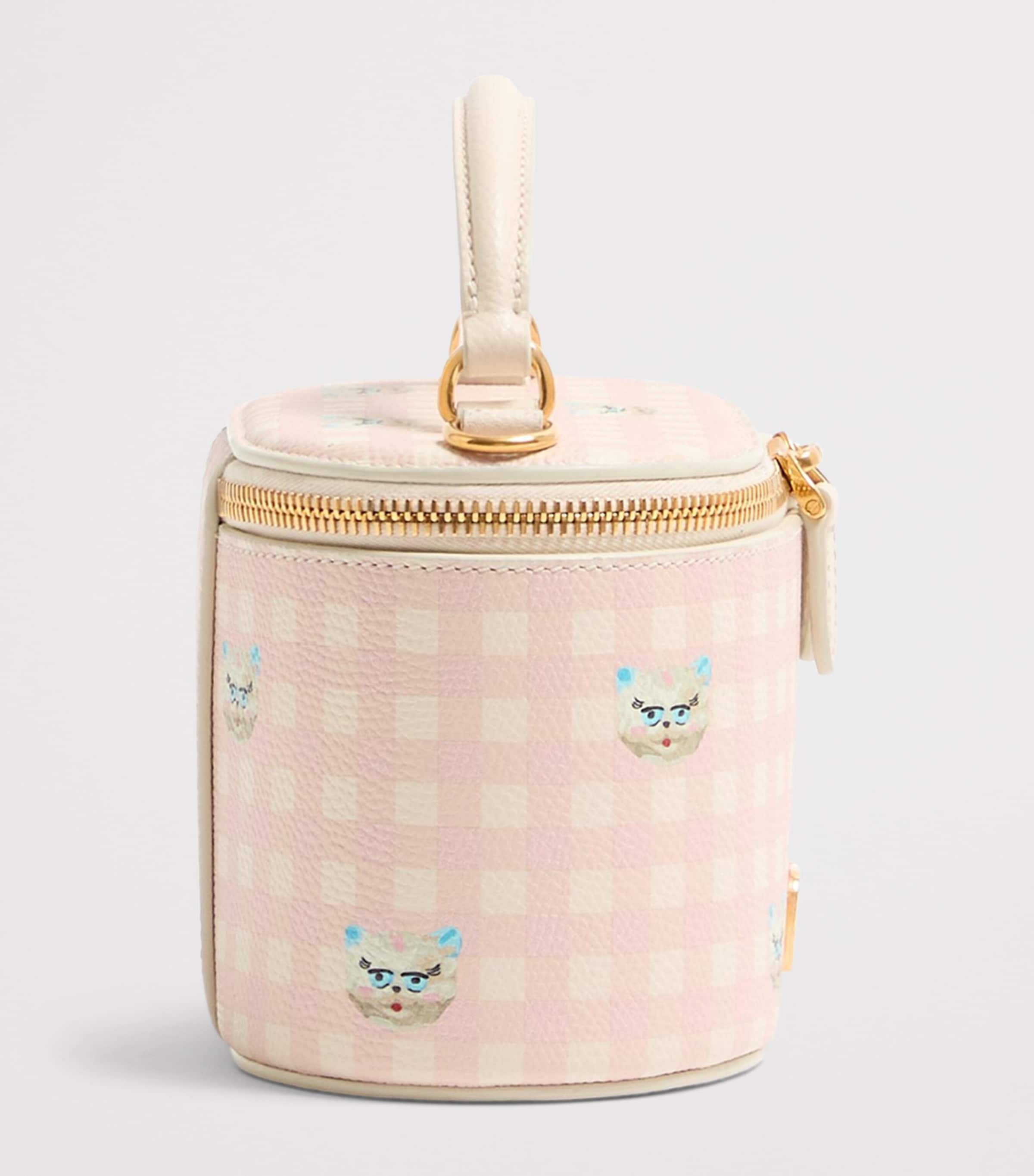 صُممت هذه الحقيبة ذات المقبض العلوي من فالنتينو، المستوحاة من حقائب مستحضرات التجميل الكلاسيكية، لتجمع بين سحرٍ مرحٍ وصنعة إيطالية فاخرة. صُنعت من جلد عجل منقوش بنقشة مربعات، ومغطاة بطبعة "لو تشات دو لا ميزون" لتُضفي لمسةً ساحرةً وخيالية.