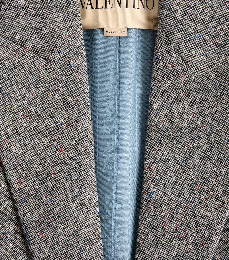 يرتقي فالنتينو بالتصميم الكلاسيكي إلى مستوى جريء مع هذا المعطف القصير، مستوحيًا روح ورشات الدار الرومانية، حيث ميّزت الخياطة الدقيقة وعشق التصاميم الجريئة أزياء النساء لعقود. ياقته المنظمة وخطوطه المزدوجة المنحوتة وخياطته المتباينة الدقيقة تحوّل التقنيات التراثية إلى لمسة عصرية عملية.