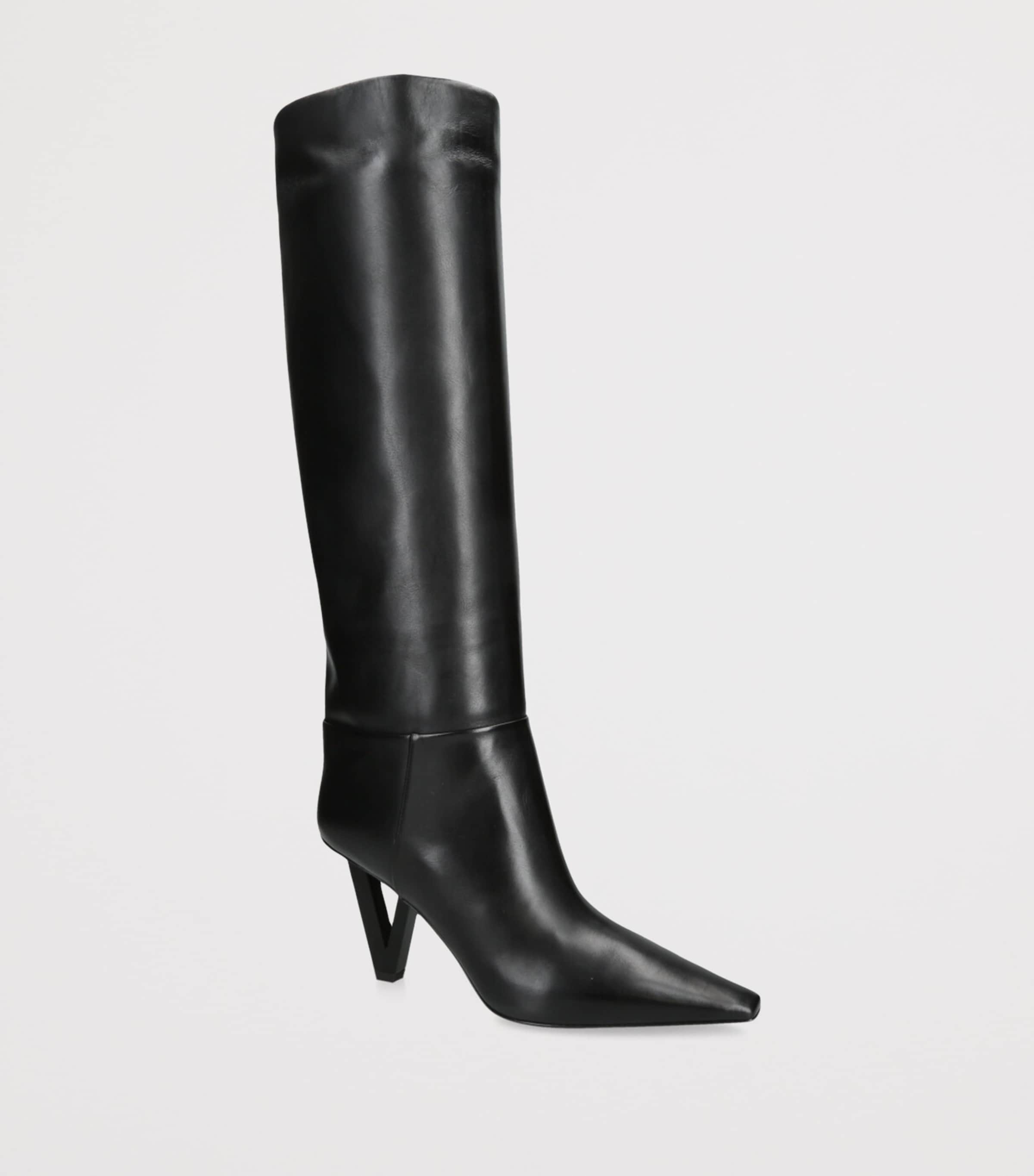 حذاء بوت طويل حتى الركبة بكعب على شكل حرف V من الجلد الأسود من فيرساتشي 85