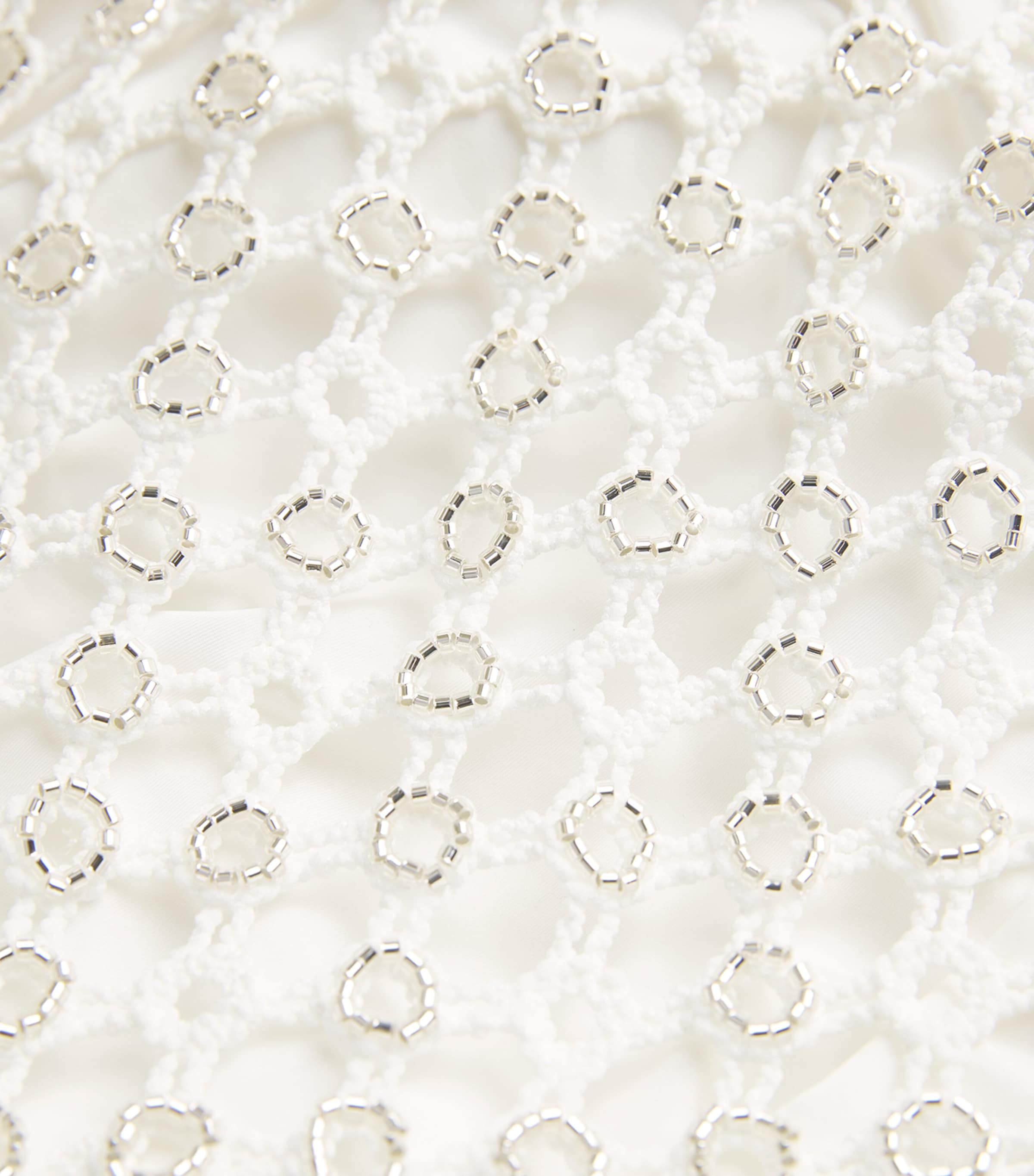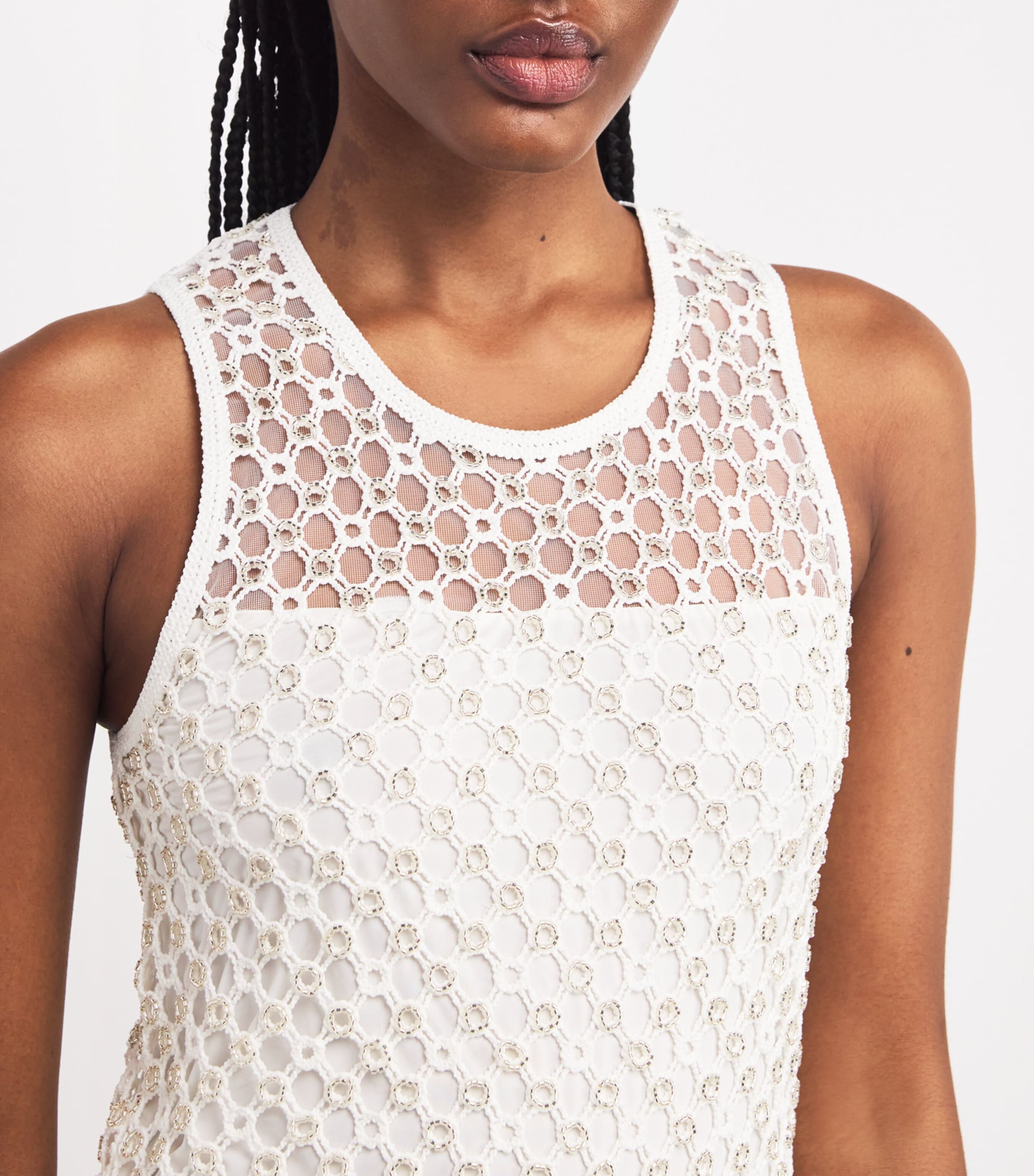 فستان متوسط الطول أبيض اللون مزين بالخرز والكروشيه