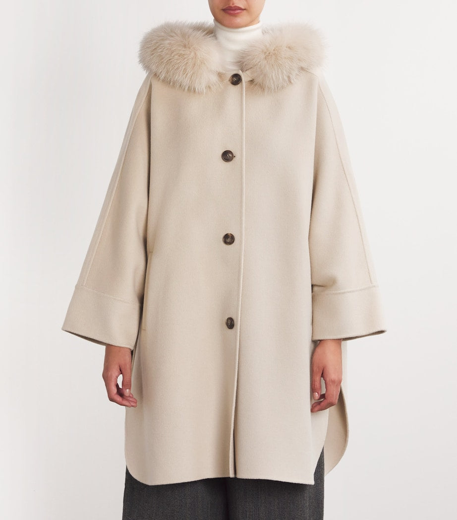 معطف كيب من الصوف والكشمير باللون البيج من إيف سالومون مع حواف من الفرو