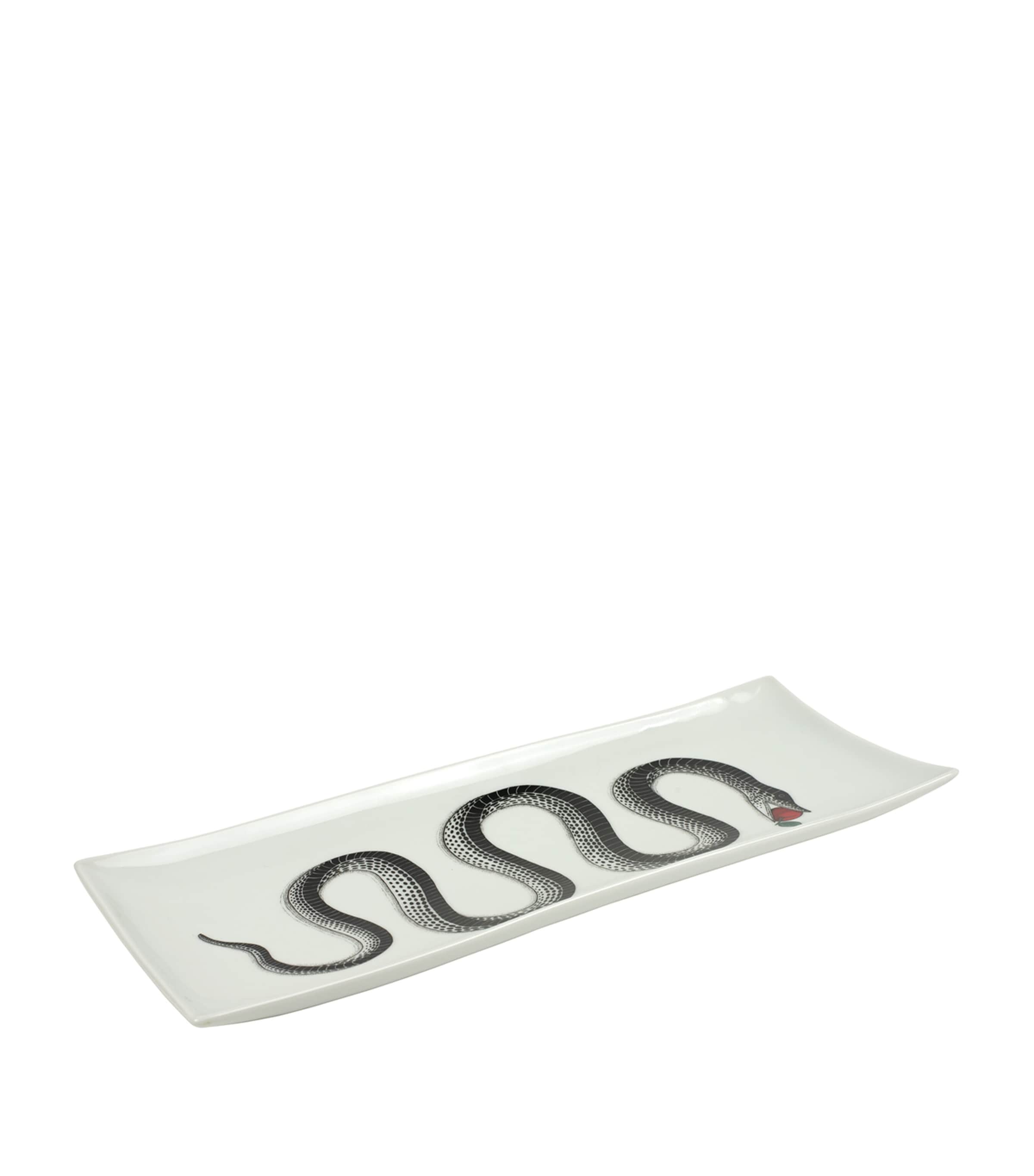 Lending a beautifully enigmatic touch to your interiors the way only a Fornasetti piece can, the Peccato Originale tray is an artistic vision in delicate porcelain. Presented in a versatile rectangular shape, it sees a snake glide across the understated backdrop – a direct reference to the biblical Genesis.