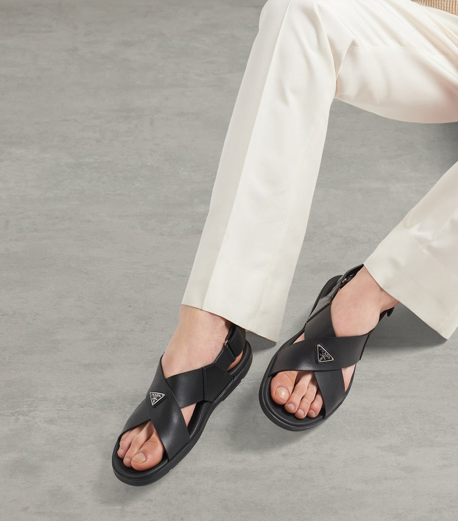 صندل كلاسيكي من علامة تجارية عريقة، هذا الحذاء المفتوح من برادا سيظل بالتأكيد ضمن تشكيلة أحذيتك الصيفية لسنوات قادمة. مصنوع من جلد ناعم بتصميم متداخل، يتميز بقصة أنيقة وبسيطة، ومزين بشعار العلامة التجارية الشهير المثلث.