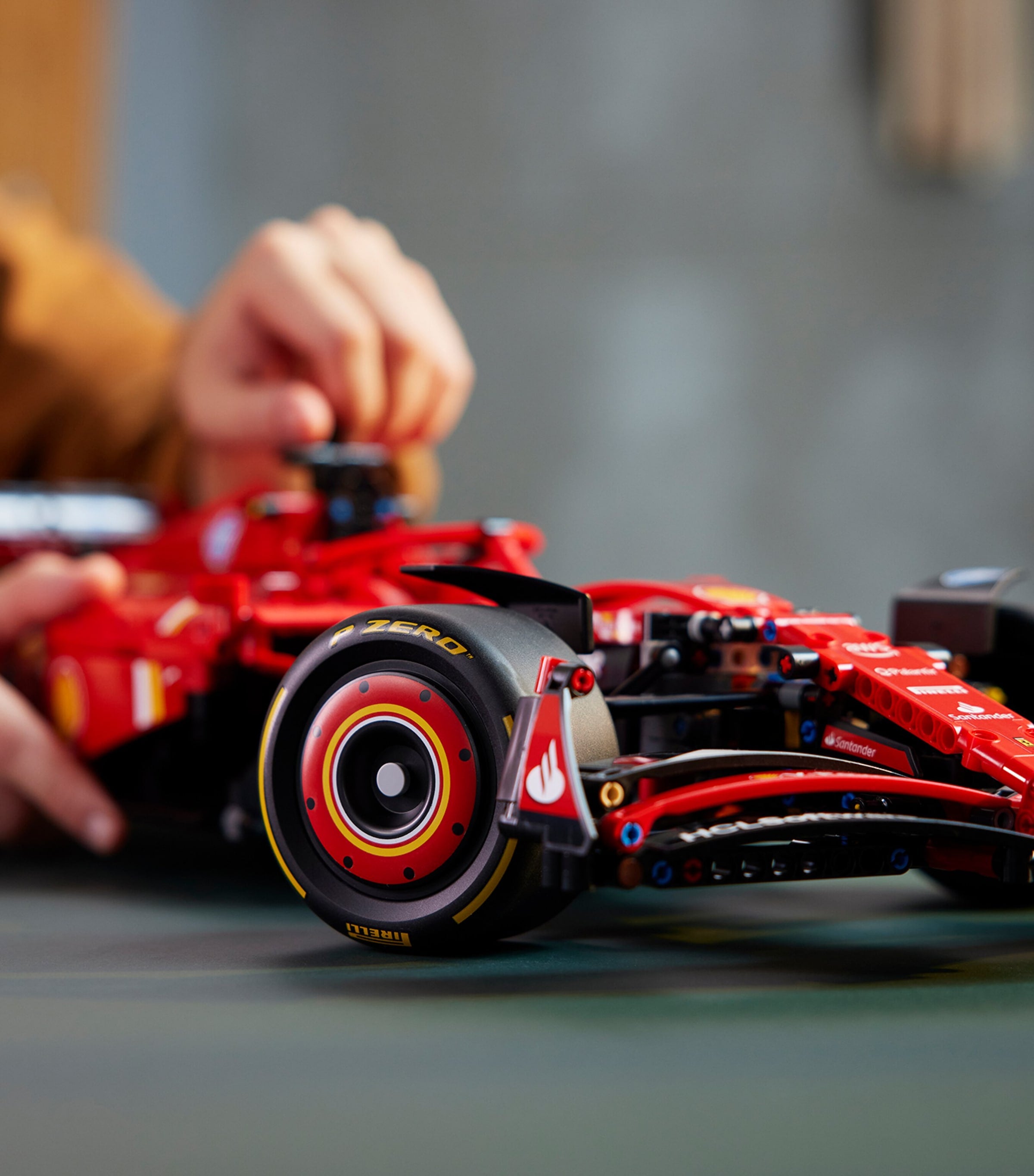 Channel your passion for The Red Devils with this LEGO Technic set. A meticulous recreation of Ferrari's SF-21 F1 car at a 1:8 scale, the set features steering, a 2-speed gearbox, printed tires and an adjustable spoiler. Step into the pit by removing the engineer cover, revealing the intricately depicted V6 engine and spinning MGU-H.