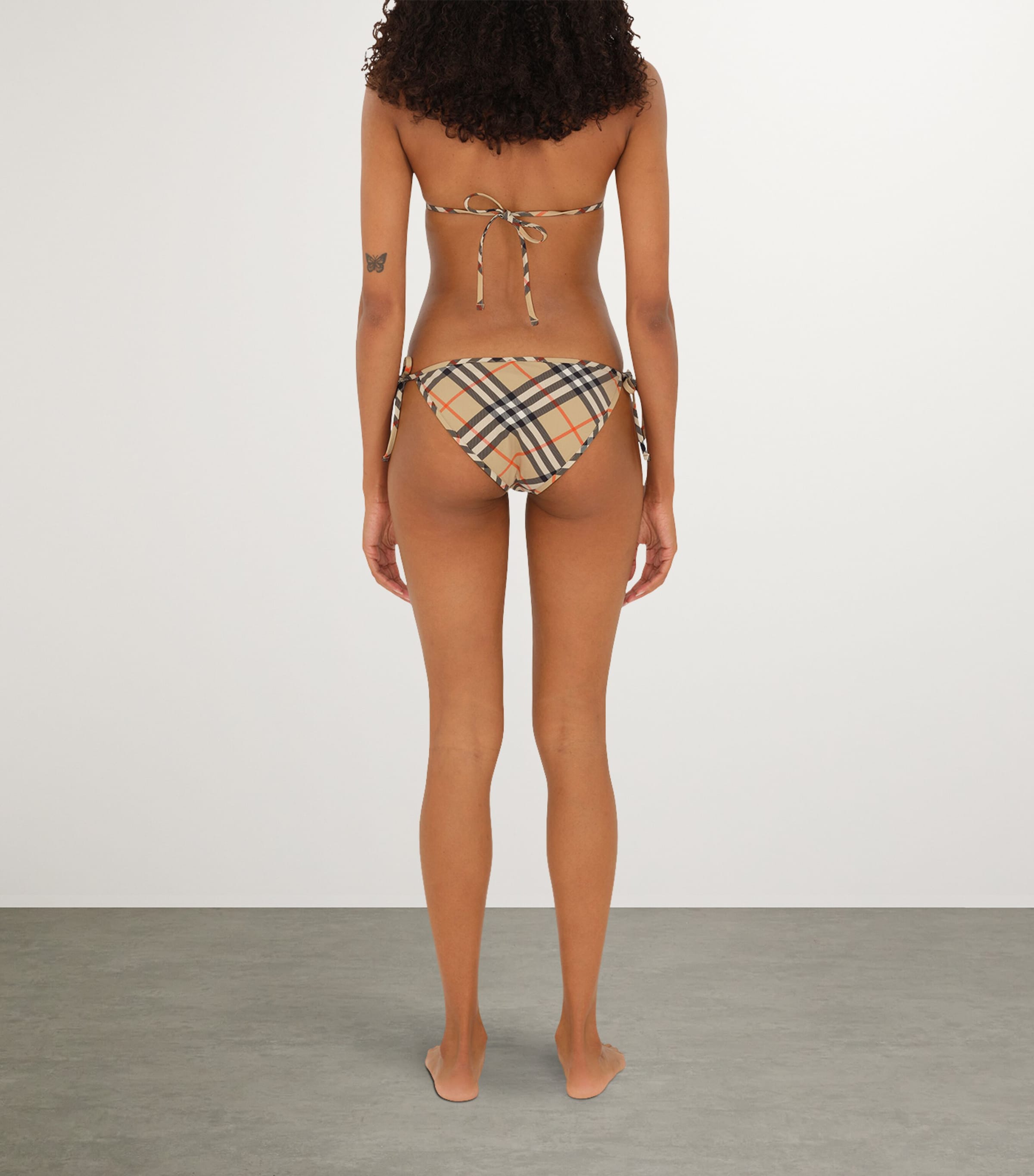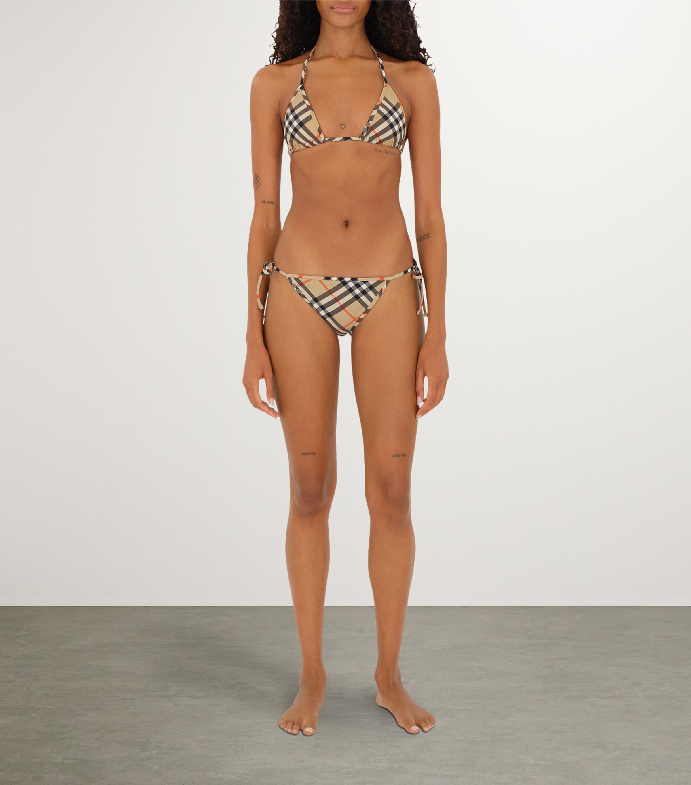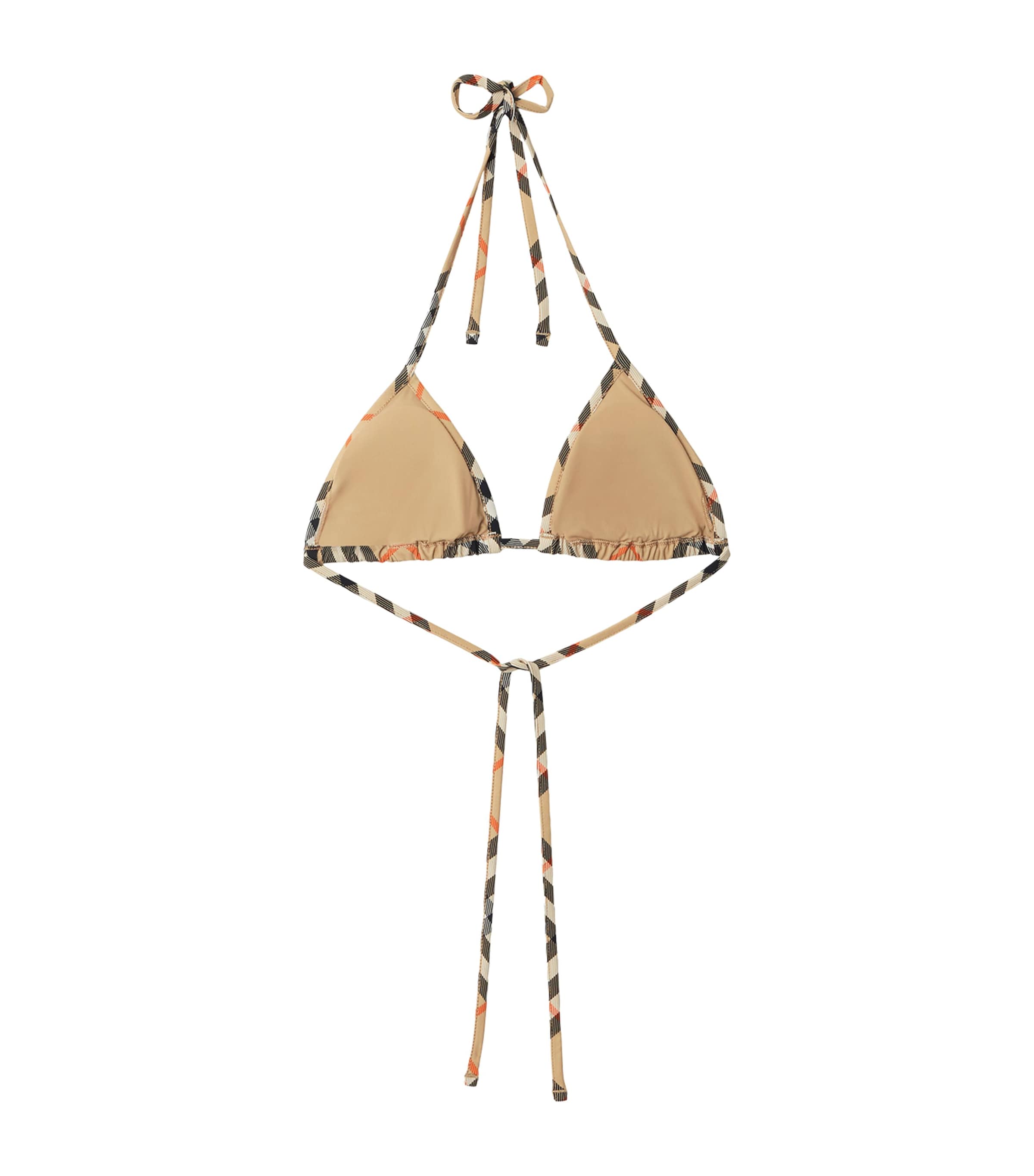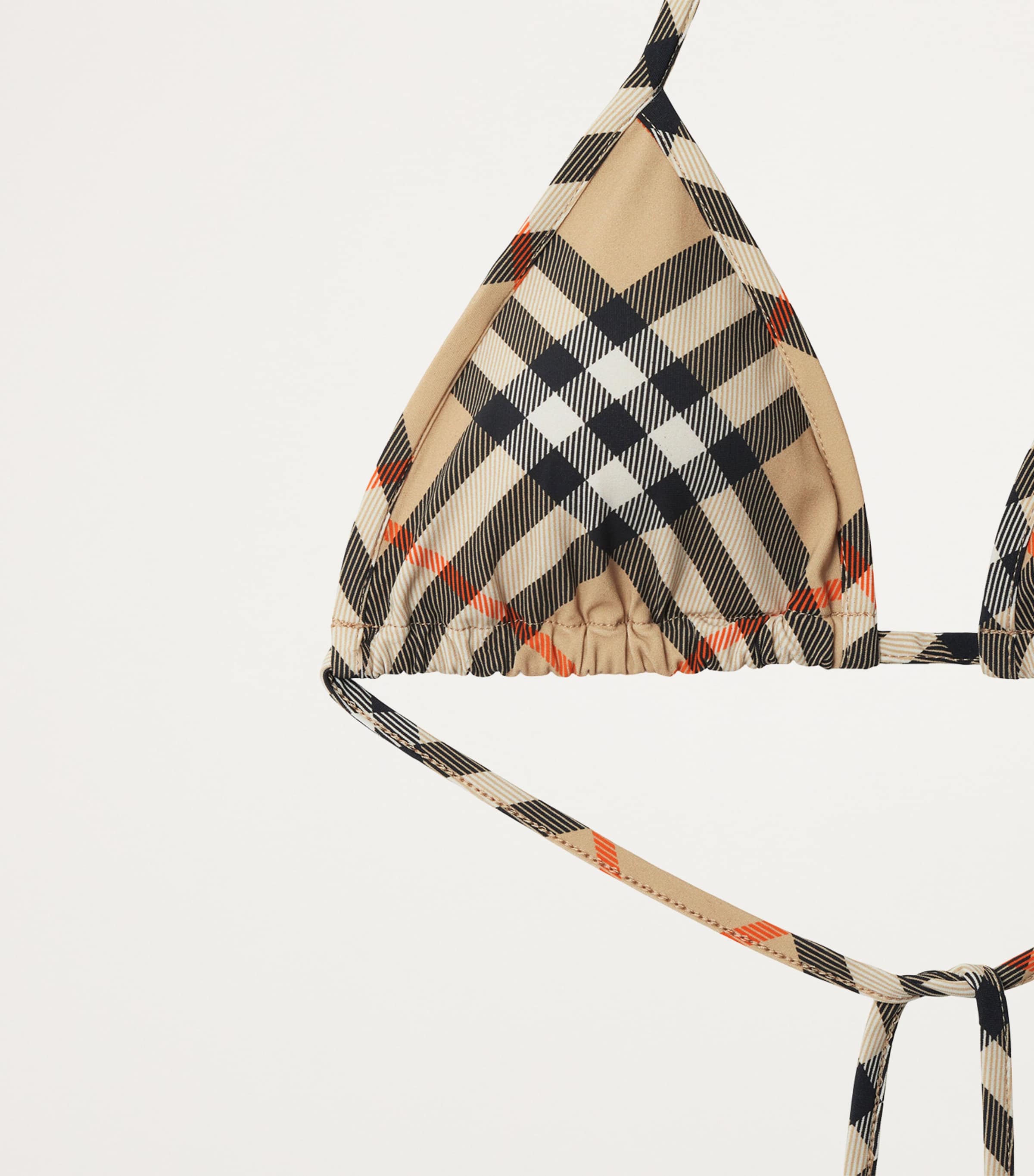 مستوحى من أنماط التارتان الاسكتلندية التقليدية، واستُخدم لأول مرة لتبطين معاطف الخندق الخاصة بالدار في عشرينيات القرن الماضي، يُعدّ نقش "بيربري تشيك" رمزًا عالميًا للحرفية البريطانية. وهكذا، فإن أصول هذا الجزء العلوي من البكيني واضحة وضوح الشمس، أيًا كان الشاطئ أو المسبح الذي تزورينه.