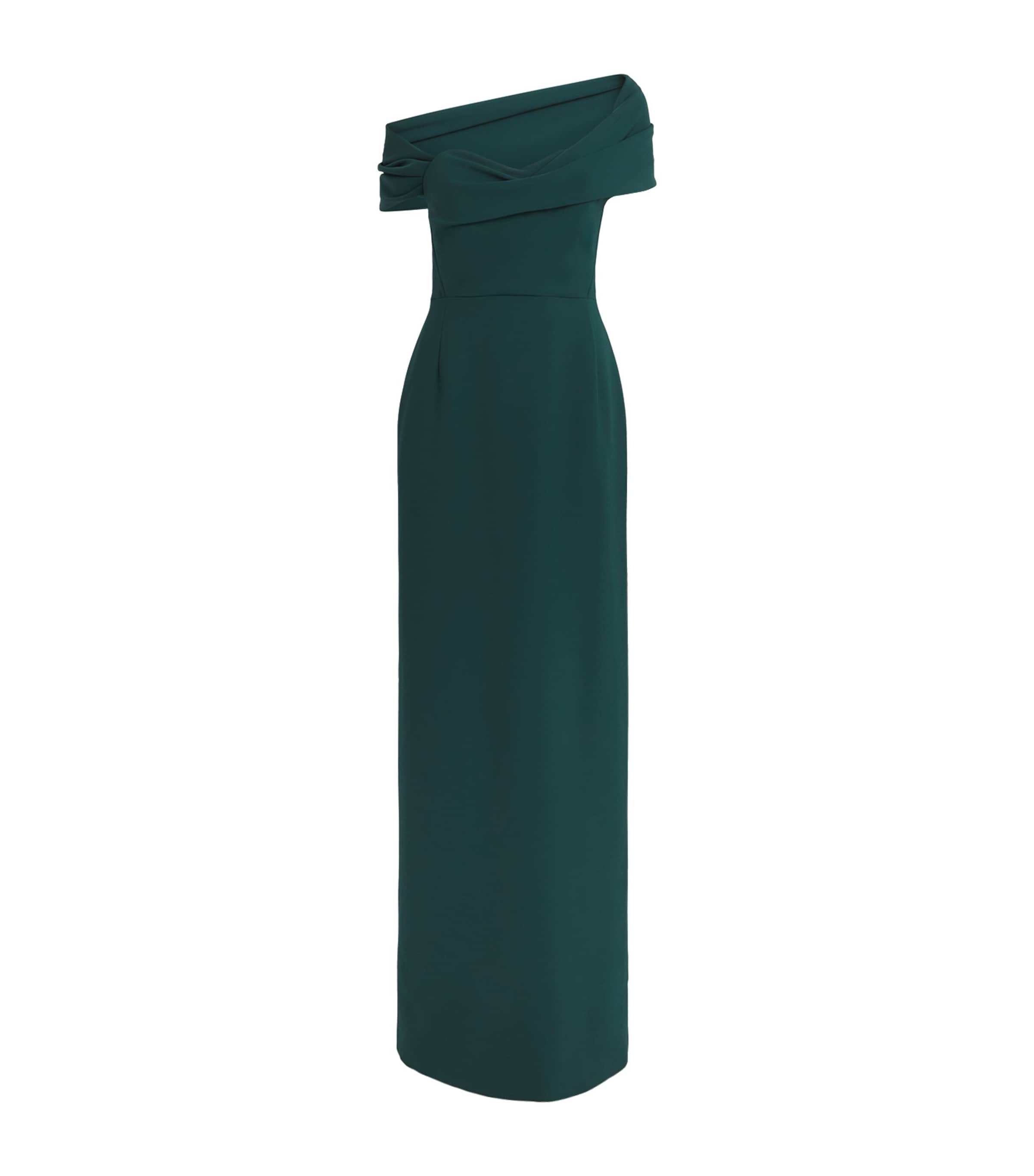 Für die Herbst/Winter-Kollektion 2025 ließ sich Carolina Herreras Kreativdirektor Wes Gordon von Jerzy Kosińskis Buch und dem gleichnamigen Film von 1979 inspirieren und erkundete das Konzept vergänglicher Schönheit und Natur. So präsentiert sich dieses Säulenkleid in einem satten Grünton aus Crêpe, dessen schulterfreie Drapierung eine weiche, feminine Note verleiht.